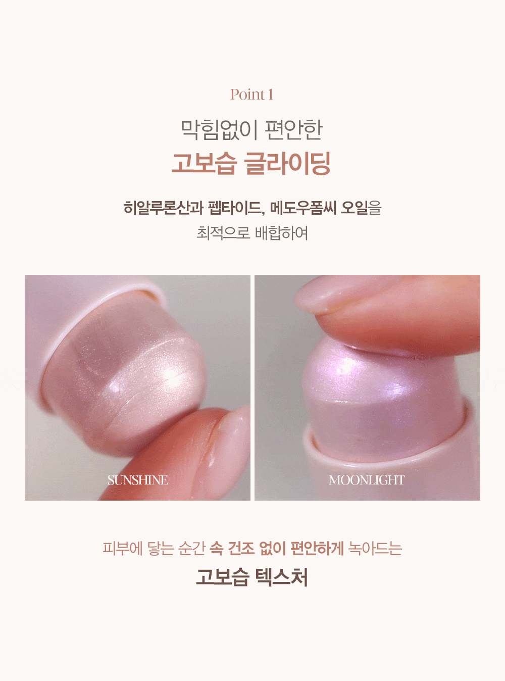 Formulated with a unique blend of hyaluronic acid, peptides, and meadowfoam seed oil, the espoir Be Glow Stick provides an ultra-hydrating texture that melts comfortably onto the skin, preventing any inner dryness. The optimal combination of shimmering glitters with high refractive oil and diverse reflecting angles ensures a clean, clear expression of radiance on the skin.