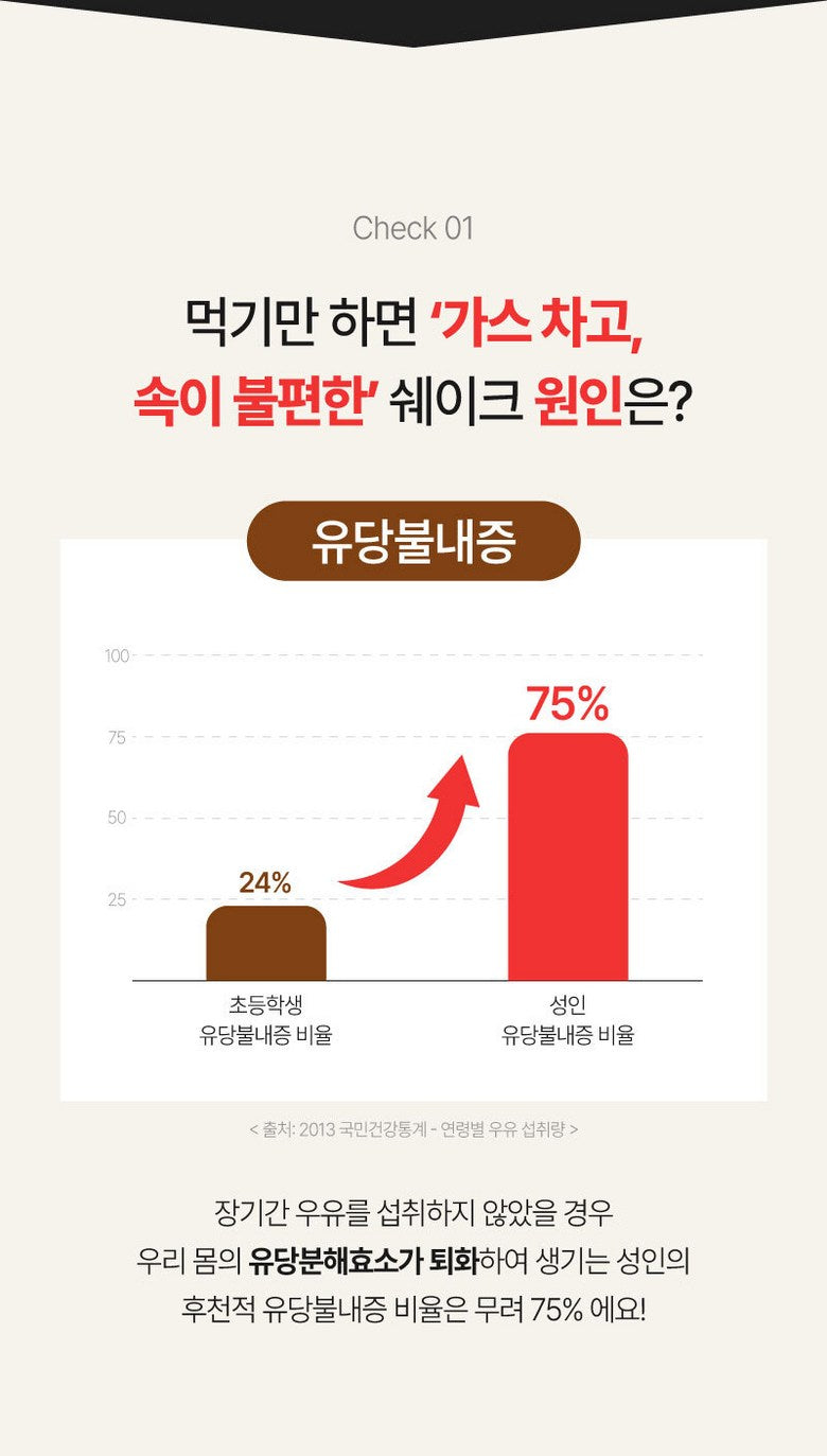 Many shakes can cause gas or bloating, a common issue for adults with lactose intolerance. 75% of adults experience this condition, as lactase—the enzyme needed to digest milk—naturally declines without regular milk consumption.
