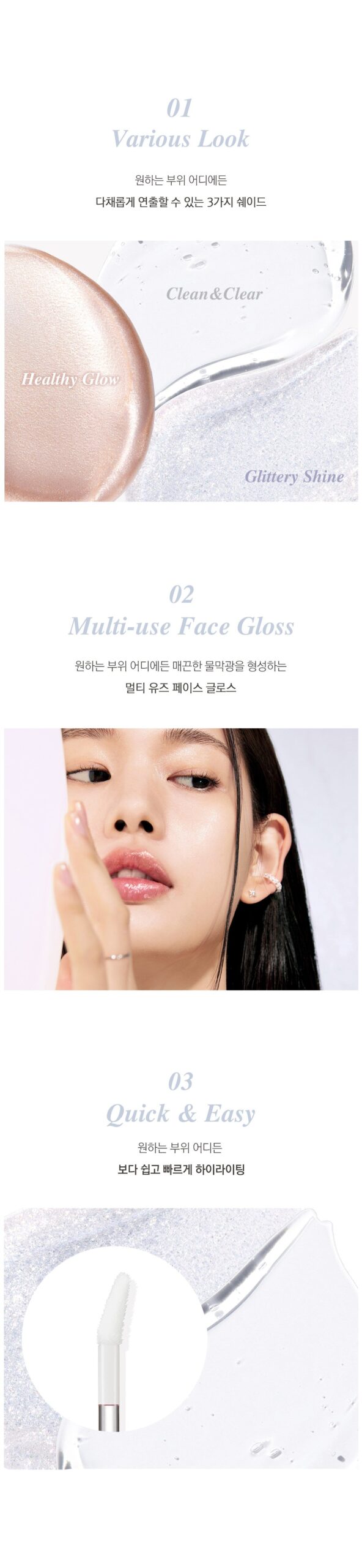 This face gloss forms a smooth, water-like film on any area you apply it, enhancing your skin’s natural radiance.