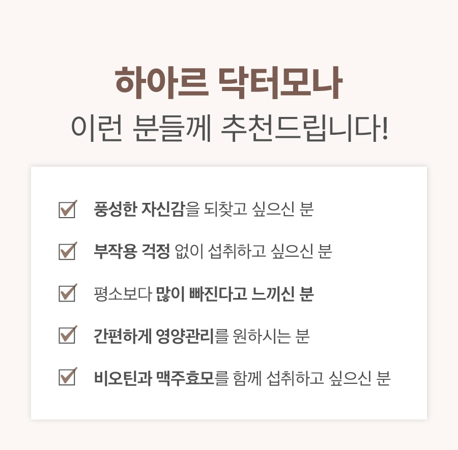 The product is recommended for those who want to be confident; those who want to take the pill without worrying about side effects; those who feel that they are losing more hair than usual; those who want simple nutrition management; and those who want to take Biotin and brewer’s yeast at once.