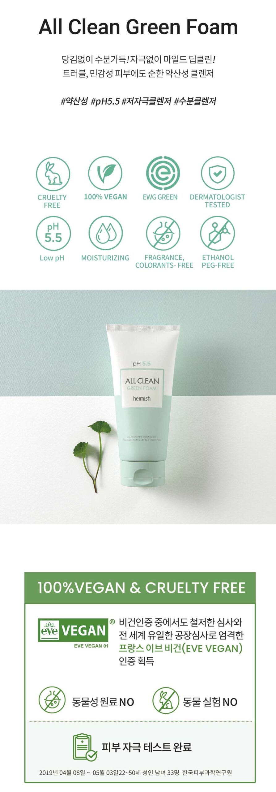 I have been using the Heimish pH 5.5 All Clean Green Foam for a month now, and I am truly impressed with its gentle formulation. This cleanser has a slightly acidic pH that perfectly balances my skin without stripping it of moisture. I appreciate how it provides full moisturization while still effectively removing dirt and makeup. My skin feels fresh and calm after each wash—no irritation whatsoever! It’s particularly fantastic for sensitive areas as well; I’ve noticed fewer breakouts since switching to this product.