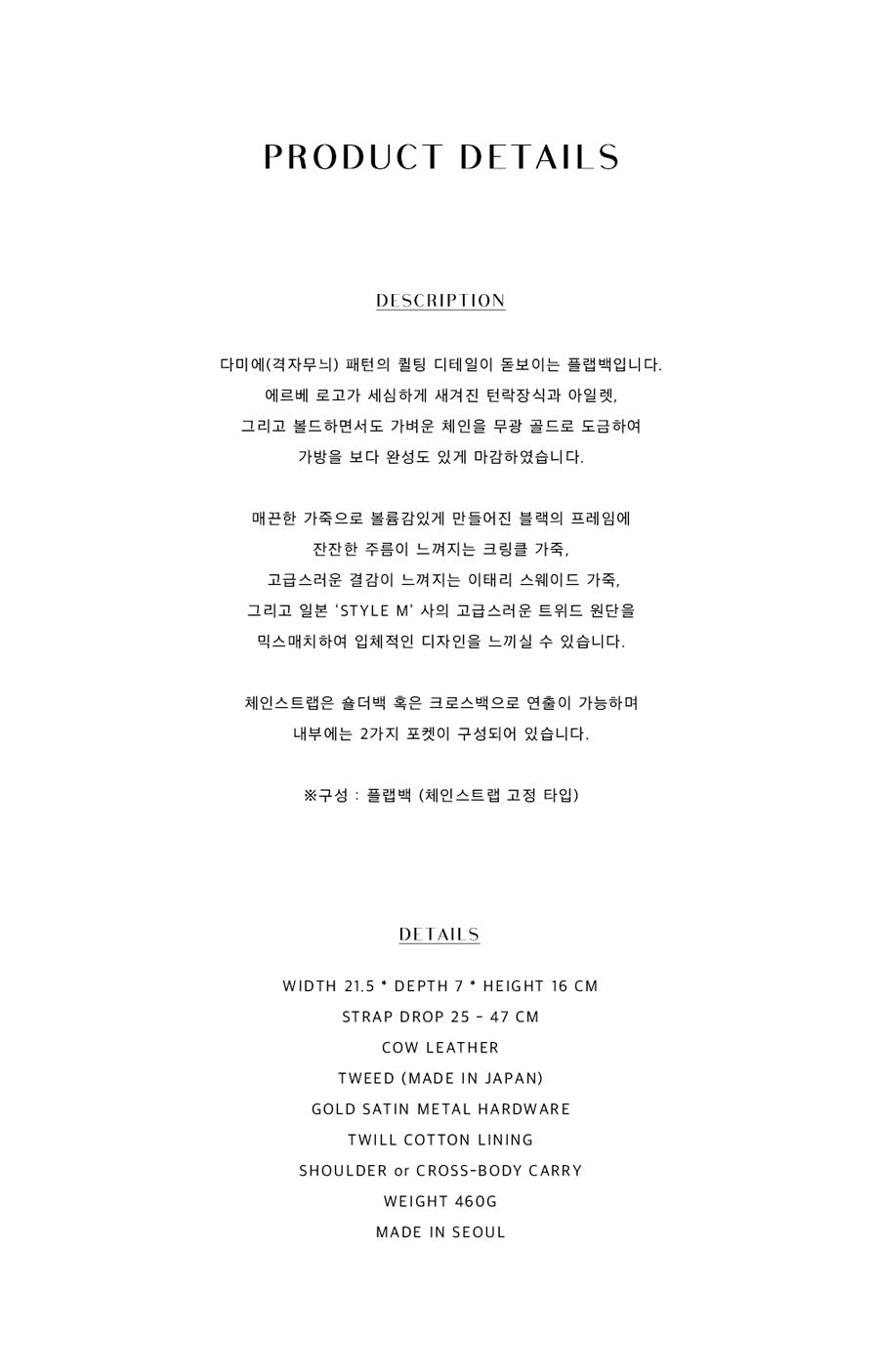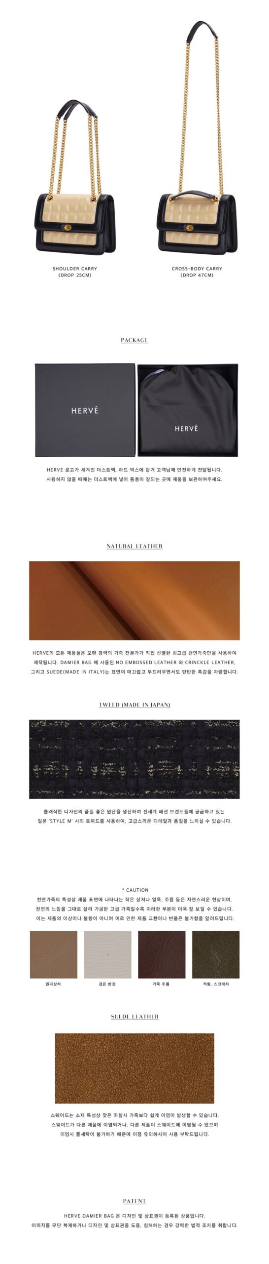 HERVÉ takes pride in its commitment to using only the highest quality natural leather, hand-selected by seasoned experts. The NO EMBOSSED LEATHER, CRINKLE LEATHER, and ITALIAN SUEDE in the DAMIER BAG are chosen for their smooth, soft, yet durable texture. The addition of Japanese tweed from ‘STYLE M’ elevates the bag with classic, high-quality fabric, renowned globally.