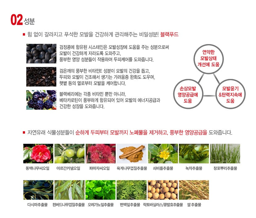 Black food ingredients such as black beans and black sesame rich in cysteine and vitamins B1 and B2, which are essential ingredients for hair growth, solidify the foundation for healthy hair growth, and blackberry ingredients rich in active ingredient beta-carotene Increases the strength of this hair