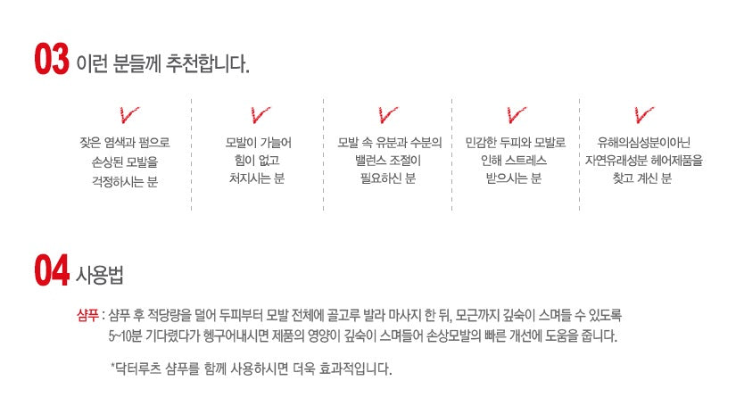 Shampoo: After shampooing, apply an appropriate amount from the scalp to the entire hair and massage. Wait 5 to 10 minutes to allow it to penetrate deep into the hair roots, then rinse.