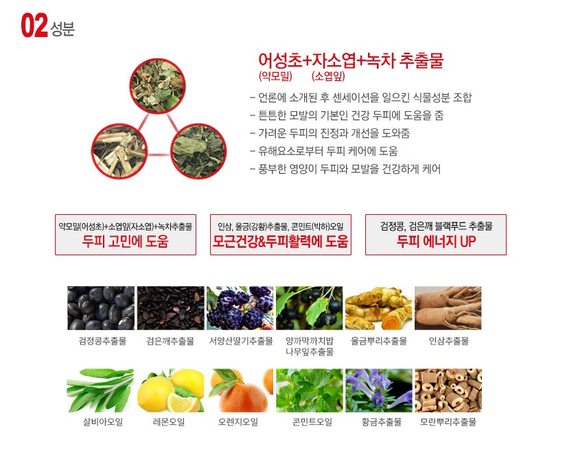 After being introduced to the media, its effectiveness has been acknowledged to the extent that a shortage has occurred, the pronoun of scalp health! Eoseongcho + perilla leaf + green tea extract helps to improve and strengthen scalp troubles.