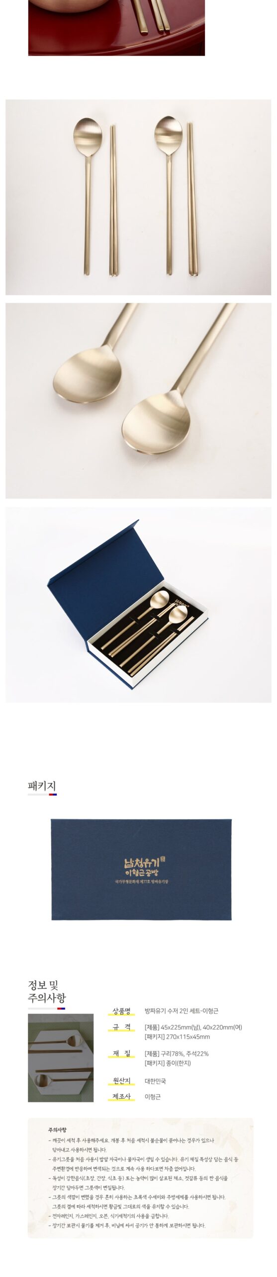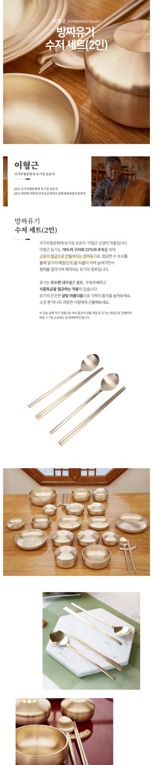 This premium Bangjja Yugi spoon set is meticulously handcrafted by Lee Hyung-Geun, a master artisan officially recognized as a National Intangible Cultural Heritage Holder for Yugi craftsmanship. Utilizing a traditional alloy of 78% copper and 22% tin, this spoon set is a prime example of Bangjja Yugi, known for its durability and unique aesthetic.