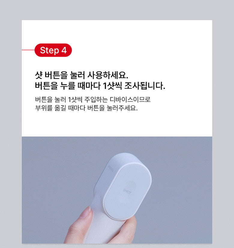 This is a device that injects 1 shot at the push of a button, so press the button each time you move the area.