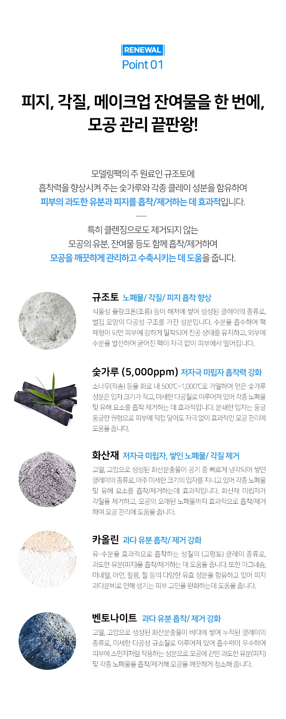 - Bentonite: Boosts absorption and removal of excess oil.