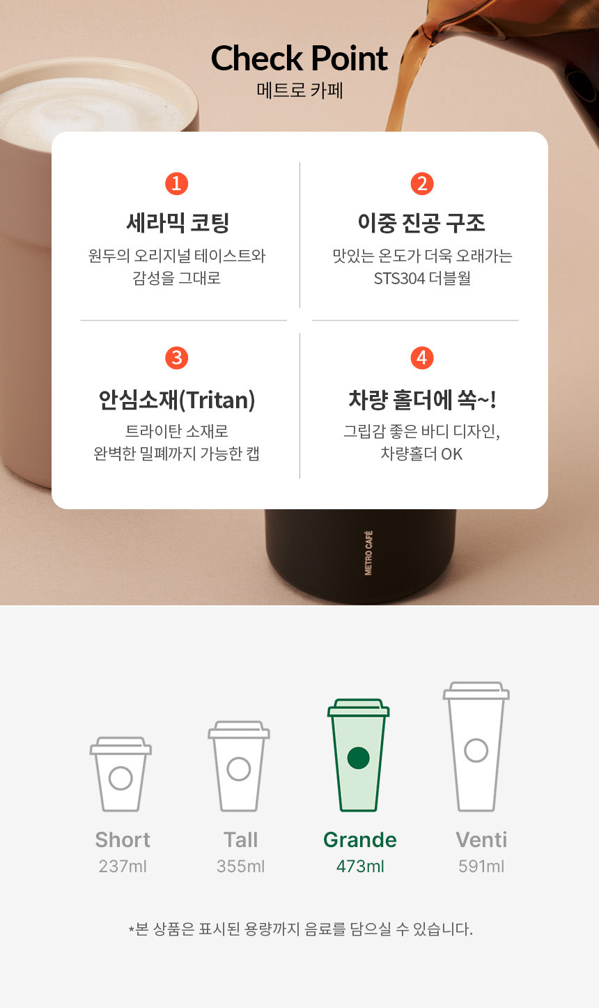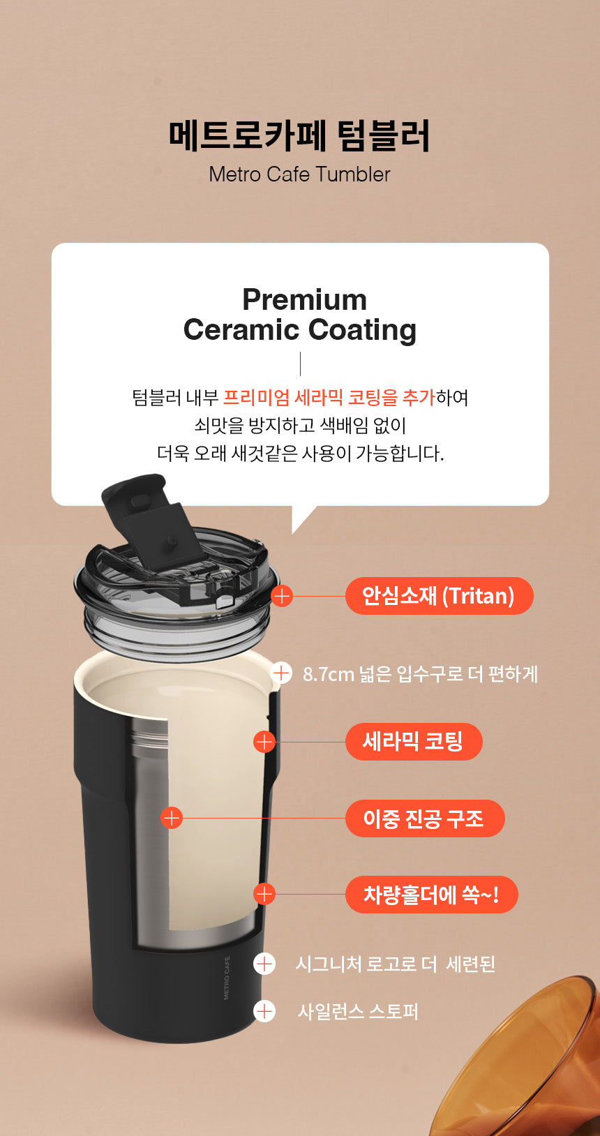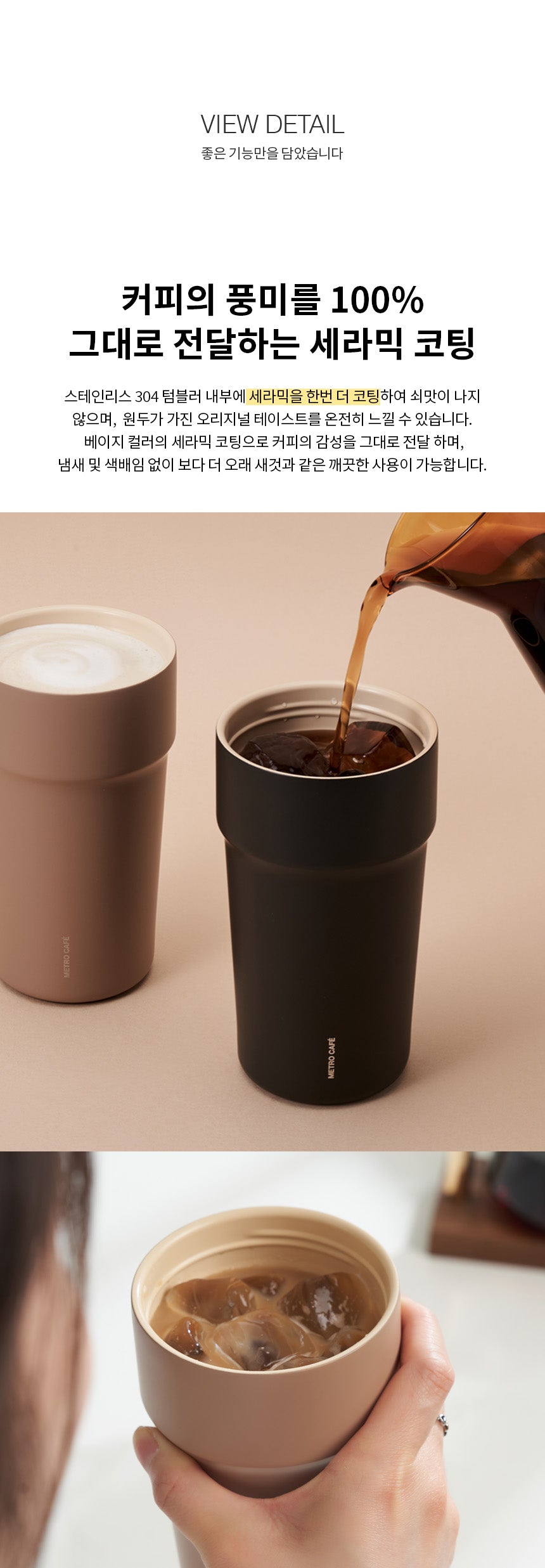The interior ceramic coating eliminates any metallic taste, allowing you to fully enjoy the original flavor of your coffee. The beige ceramic interior also prevents odor and staining, keeping your tumbler clean and fresh for longer. -