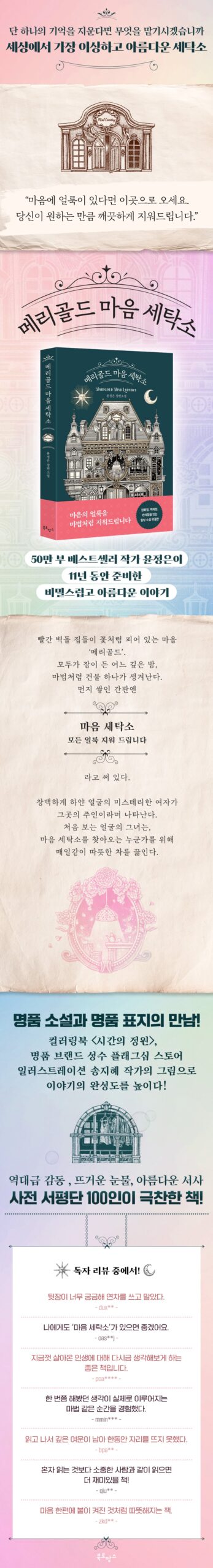 Author Yoon Jeong-eun tells through “Marigold Mind Laundry” that sadness and joy are eventually connected, just as the sun and the moon coexist in the same sky. The fact that even painful wounds can become beautiful flowers, the existence of ‘bright sadness’, the encouragement and trust of someone who makes me live again even on days when I want to give up everything, the space called ‘Mind Laundry’ and the people who come and go there show through It is a novel that allows you to shed tears together with the heartbreaking stories of the characters in 『Marigold Mind Laundry』, feel heartbroken at the way they live and overcome, and seriously think about the choices and scars of the past.