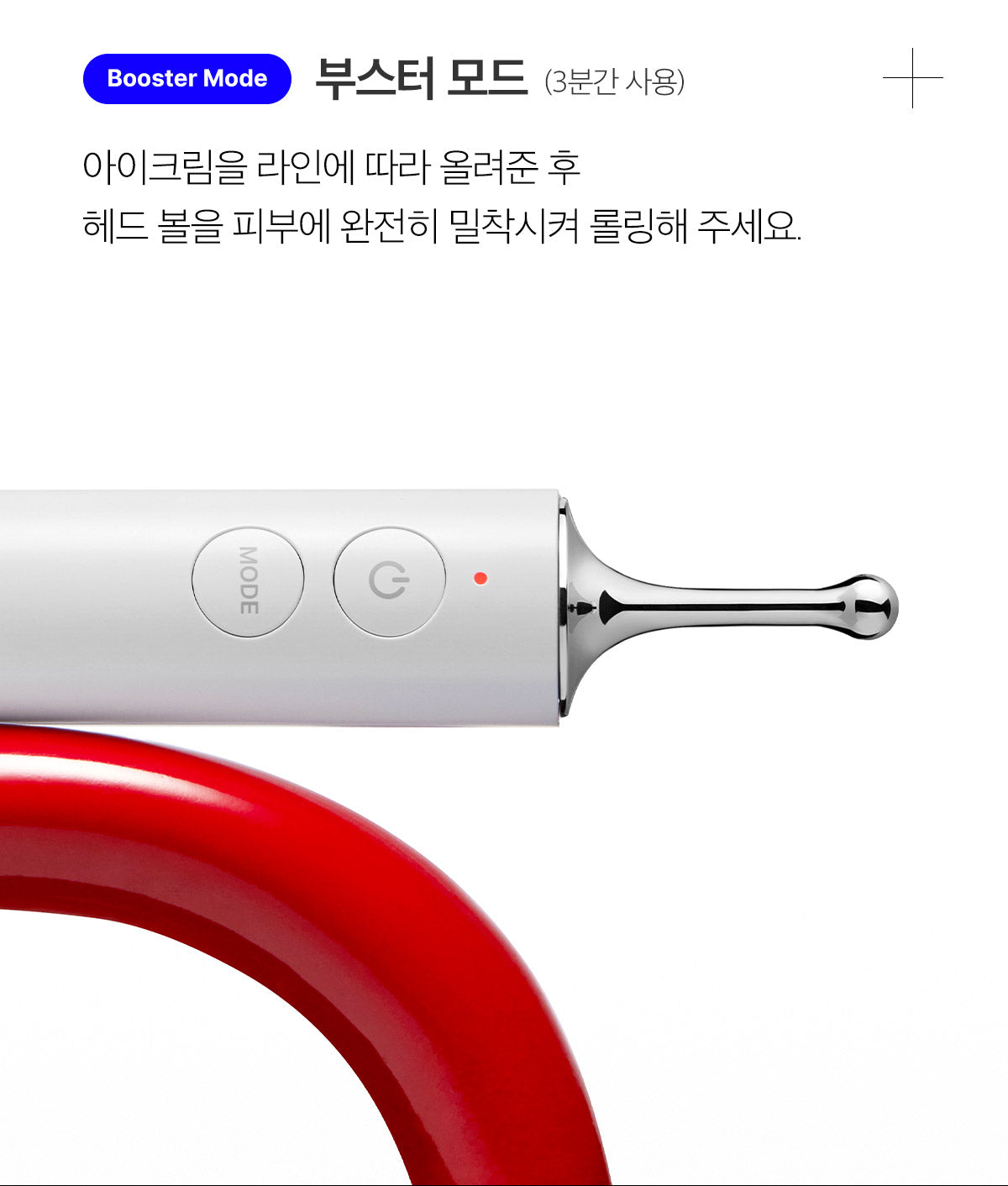 • Booster Mode (3 minutes): Apply eye cream along the lines, then use the device with the head ball fully pressed against the skin, rolling it to enhance the absorption of the active ingredients.