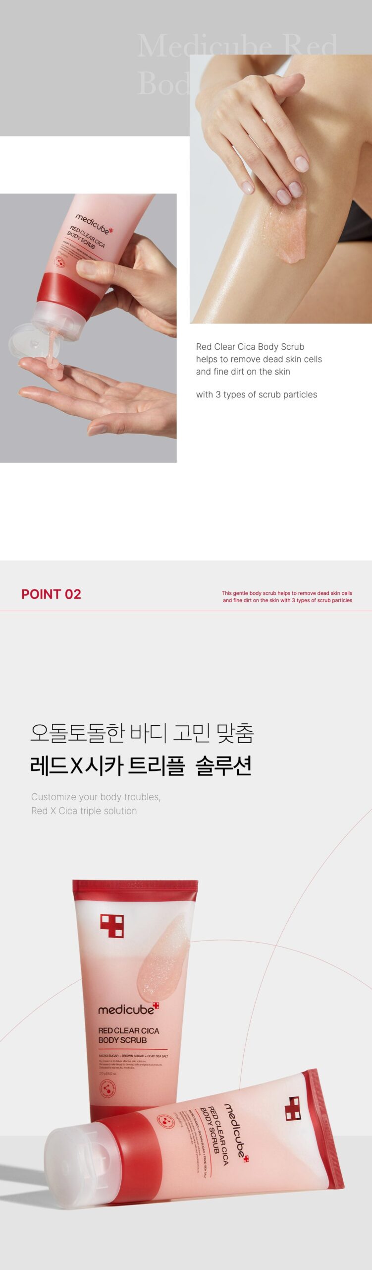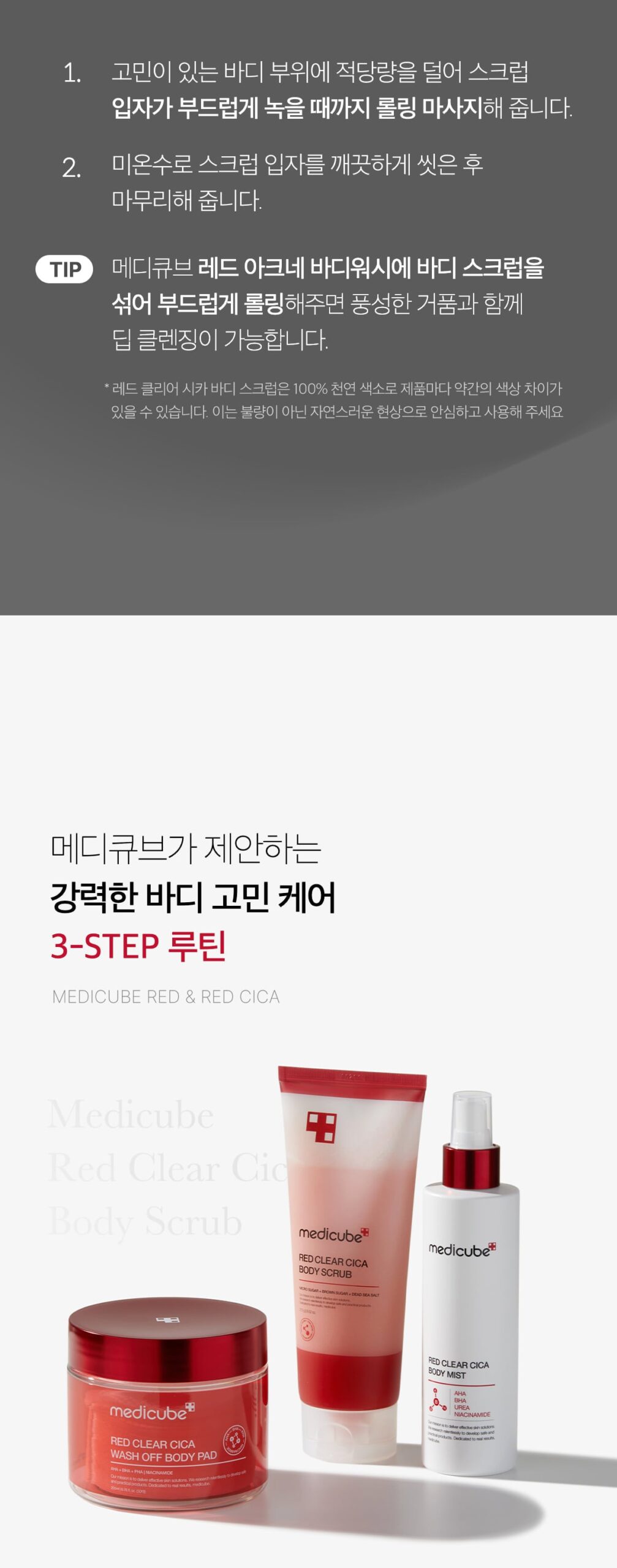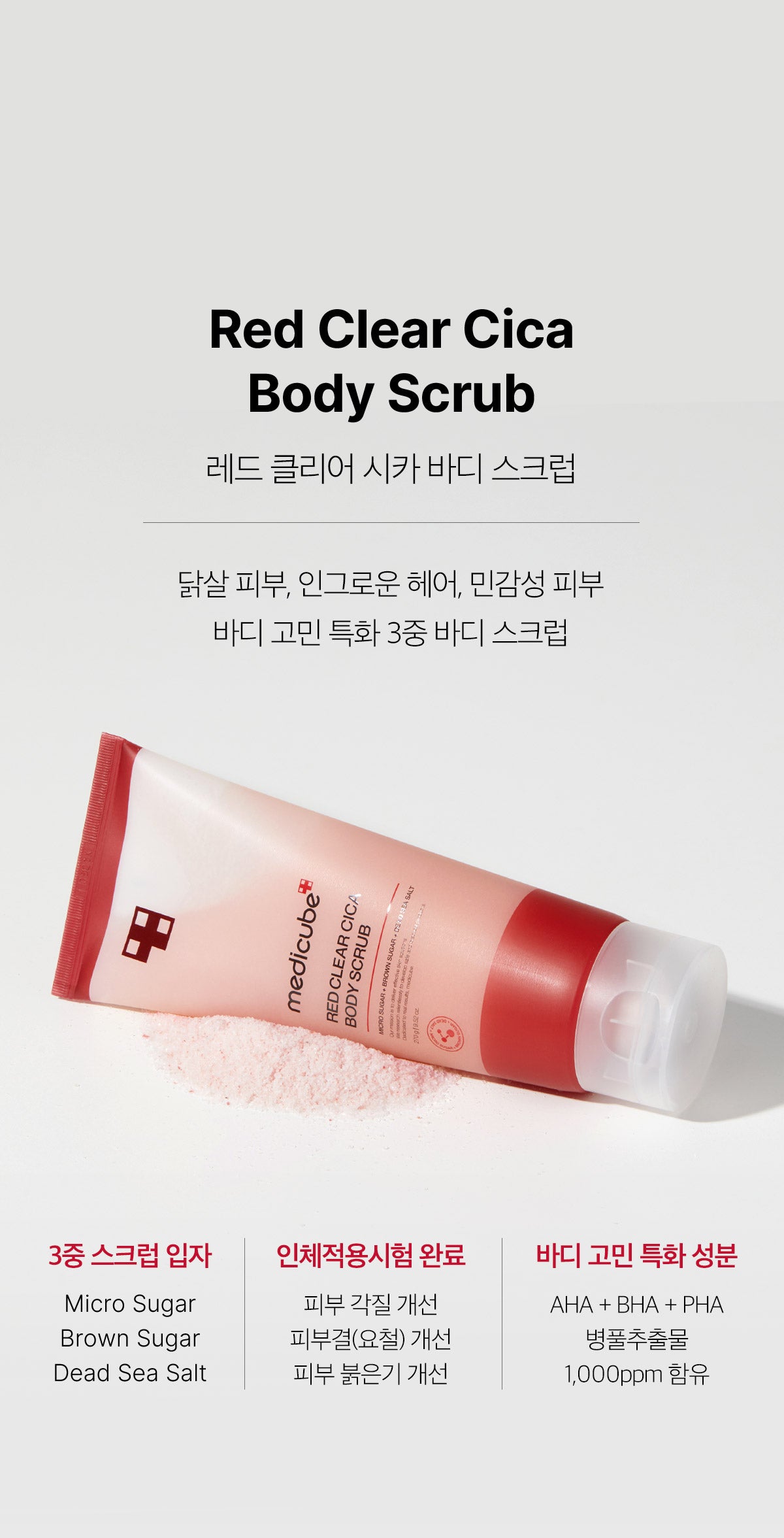 Experience the transformation of your skin with the Medicube Red Clear Cica Body Scrub, specially designed for those battling acne-prone skin, unsightly bumps, and ingrown hairs. This innovative body scrub merges the benefits of physical and chemical exfoliation to rejuvenate and refresh your skin. Its unique blend of BHA, PHA, and Niacinamide, combined with a trio of natural scrub particles, provides a gentle yet effective treatment for sensitive body skin.