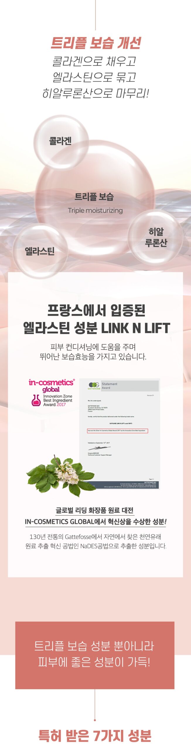 Featuring the revolutionary LINK N LIFT ingredient derived from elastin, sourced and proven in France, this component excels in skin conditioning and offers superior moisturizing effects. Extracted using the innovative NaDES method by Gattefosse, with a heritage spanning over 130 years, this natural ingredient ensures your skin receives the best care.