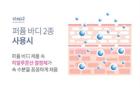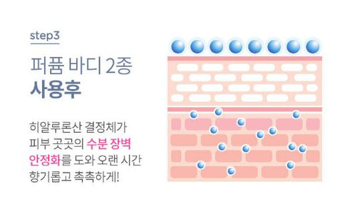 When using 2 types of perfume bodyHyaluronic acid crystals in perfume body products meticulously replenish moisture inside.