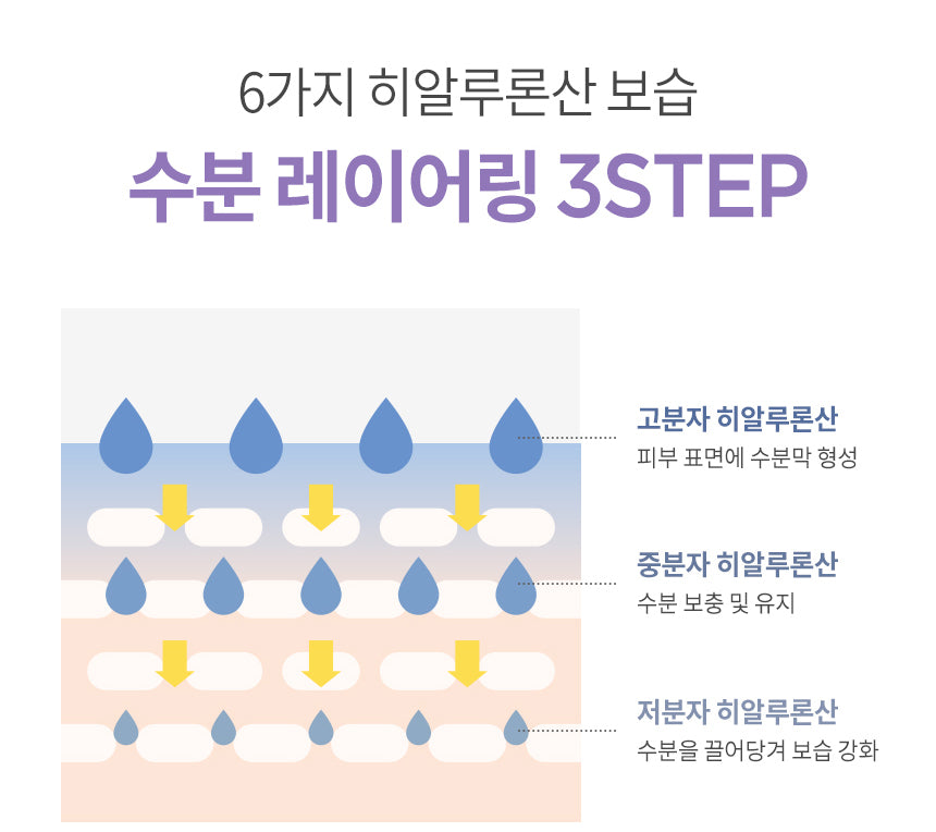 Contains 6 types of hyaluronic acid, strengthens skin moisturizing power, supplies moisture