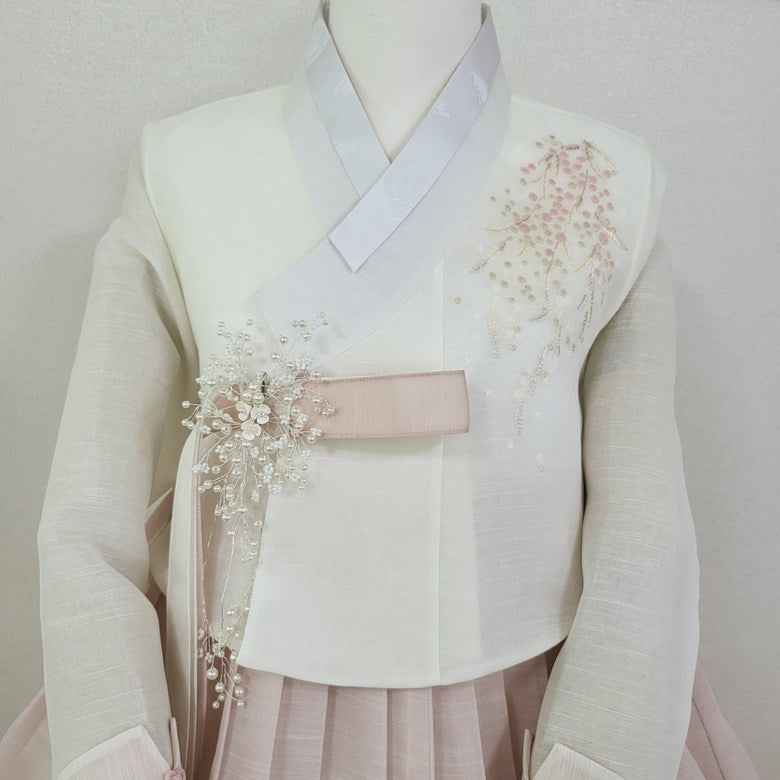 O hanbok Milky Way é uma verdadeira obra de arte! Cada bordado traz à tona a riqueza cultural coreana. A paleta de rosa leve combina com qualquer evento festivo e torna o uso super confortável.