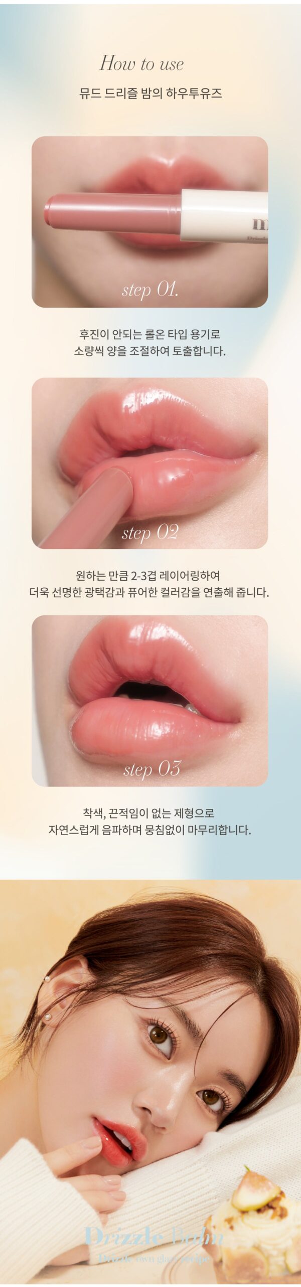 With just one touch, this balm delivers a clear shine and pure color. The drizzle texture spreads evenly, ensuring a smooth application without any stickiness or staining.