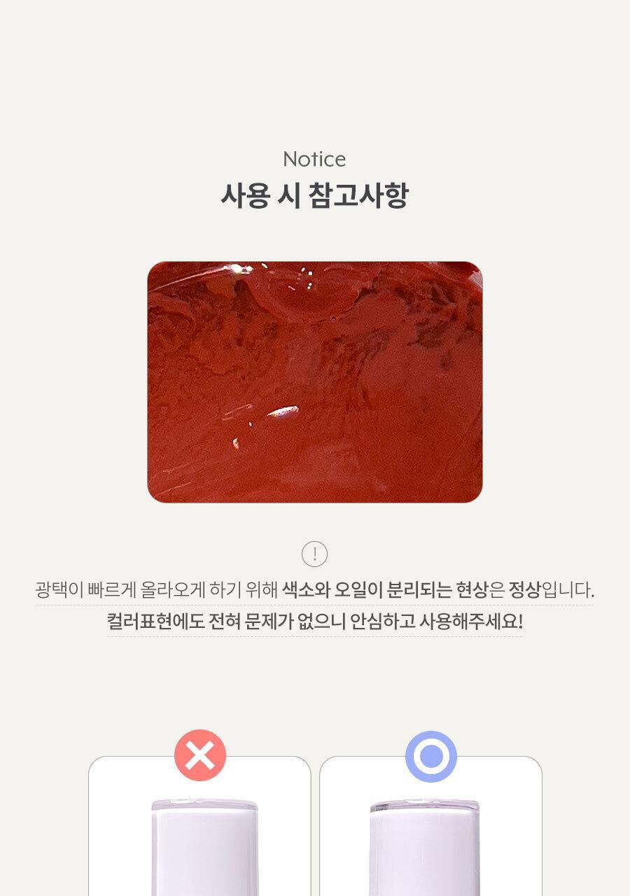 - Pigment and Oil Separation: It is normal for pigment and oil to separate quickly to enhance gloss. This does not affect product quality.