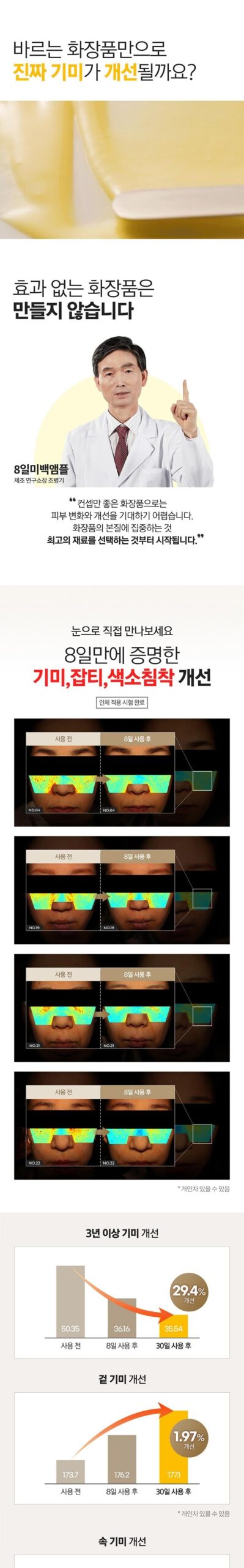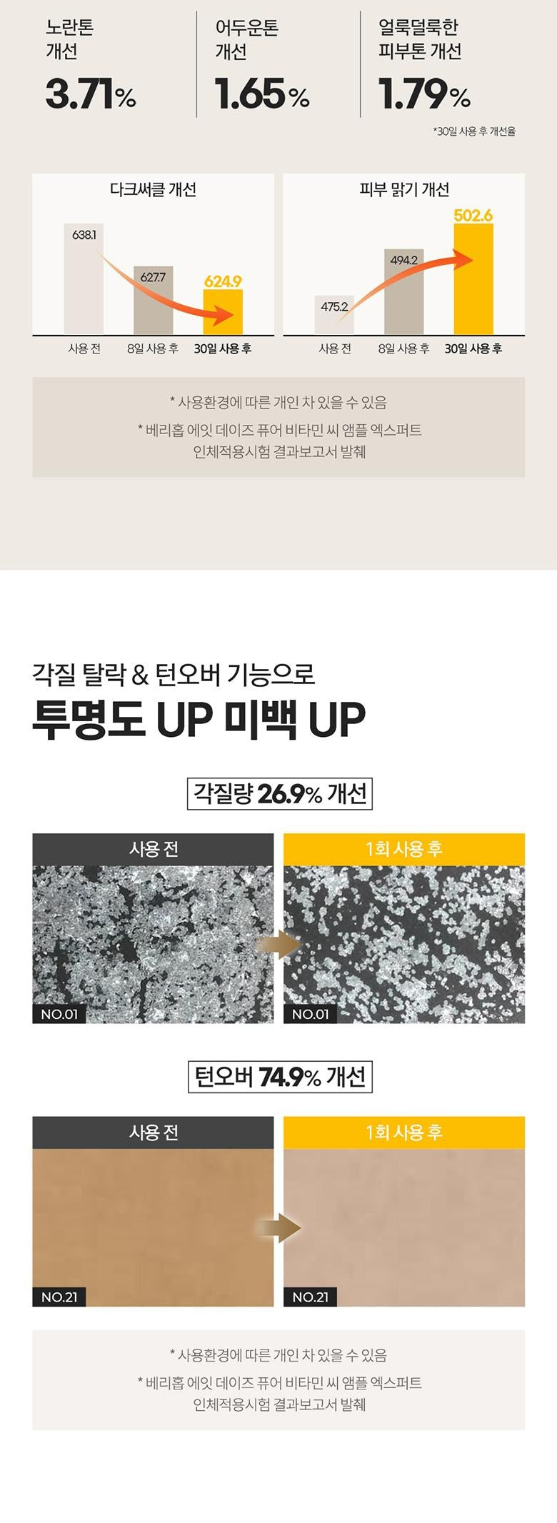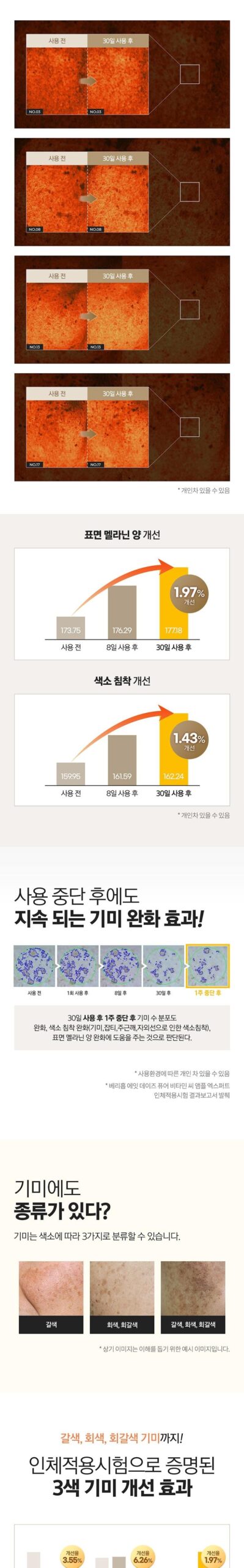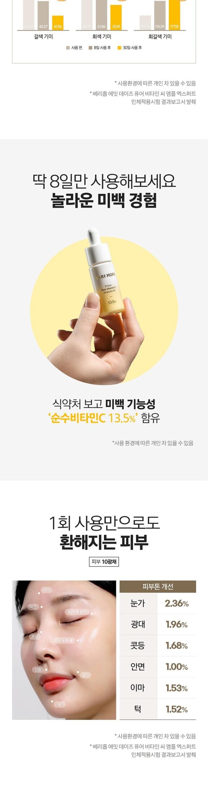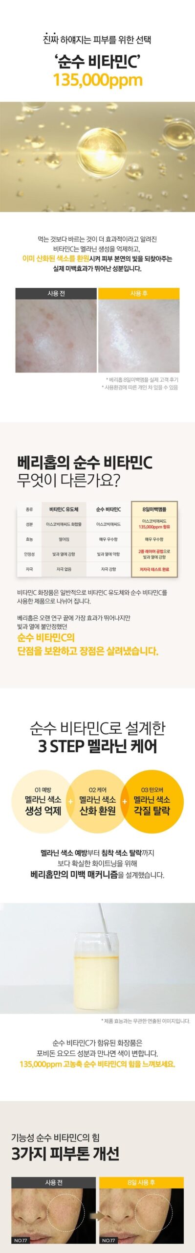 正直、最初はこの商品が本当に効果的なのか疑問に思いました。何度もビタミンCを試した結果、ほとんどが期待外れでした。しかし、VARI:HOPEの8日間ピュアビタミンCアンプルを使い始めてから、その感触や見た目には驚かされました。肌に浸透するスムースさと持続性は抜群で、明らかな変化を実感しています。特に肝斑の軽減について、高濃度な135,000ppm配合という特徴だけあって信じる価値があります。この先もぜひ使用し続けたいです。