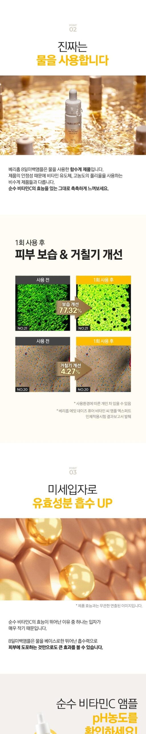 Unlike other formulations that rely on non-aqueous solutions, the 8 Days Whitening Ampoule utilizes water as its base, enhancing the natural efficacy of Vitamin C for a hydrating experience.