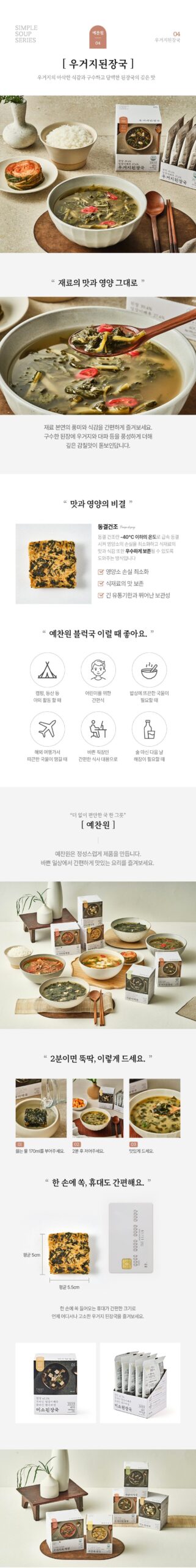 - Convenience & Versatility: Whether you’re an outdoor enthusiast, a busy office worker, or someone looking for a comforting meal after a long day, Yechanwon’s block soup is your go-to choice. It’s exceptionally convenient for camping, hiking, traveling abroad, or as a nutritious meal replacement.