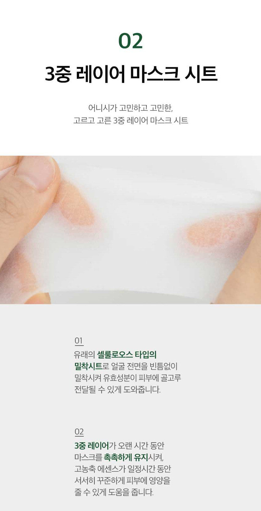 A camada tripla mantém a máscara úmida por um longo tempo, e a essência altamente concentrada ajuda a nutrir a pele lenta e constantemente por um certo período de tempo.