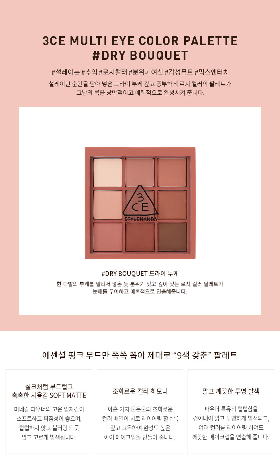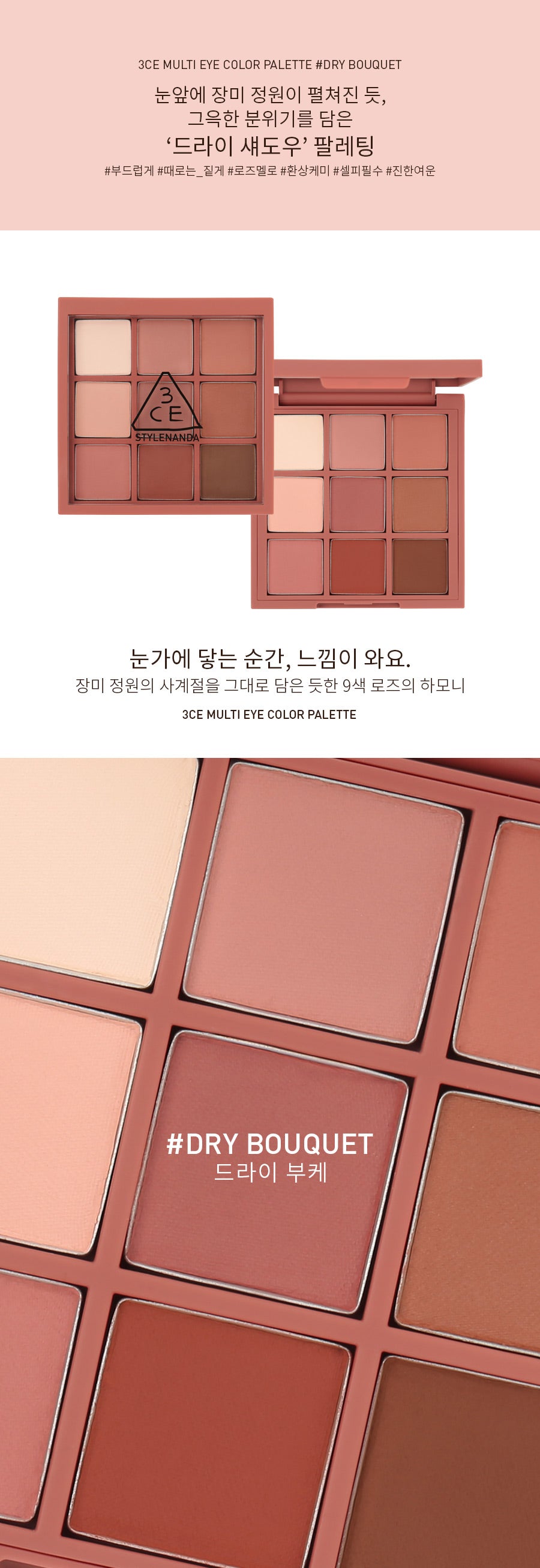 Elevate your makeup collection with the 3CE Multi Eye Color Palette #DRY BOUQUET, and bring out the allure and elegance in your eyes with every application.