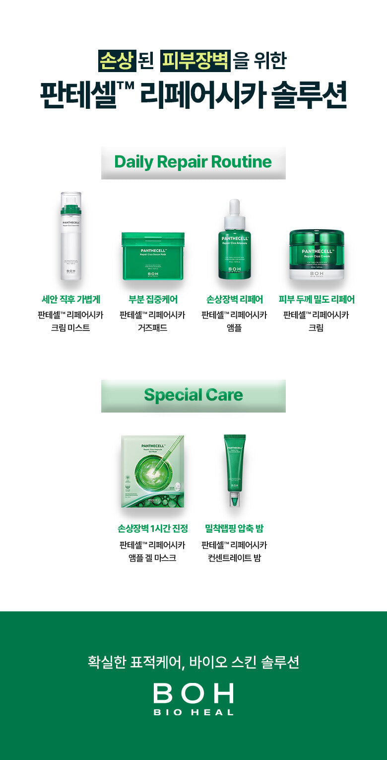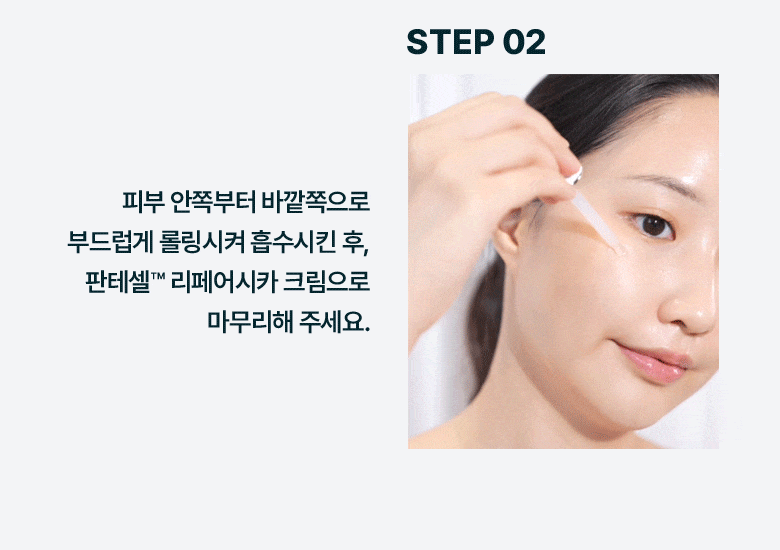 2. Gently massage from inner to outer area of the skin for absorption, and then finish with panthecel repair cica cream.
