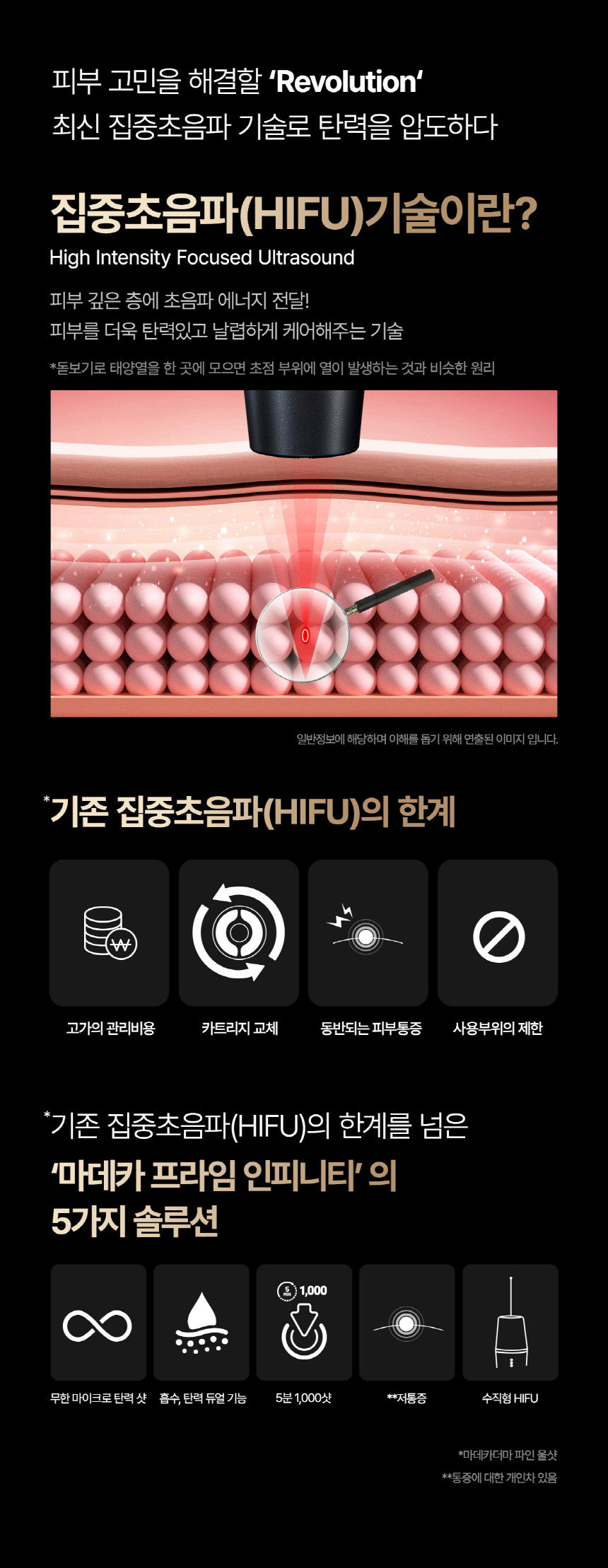 The Madeca Prime Infinity utilizes High-Intensity Focused Ultrasound (HIFU) to penetrate deep skin layers, precisely delivering ultrasound energy. This technology enhances skin elasticity and contours, offering a non-invasive solution to skin aging.