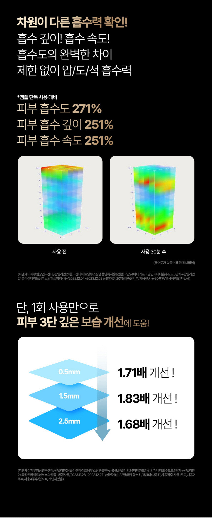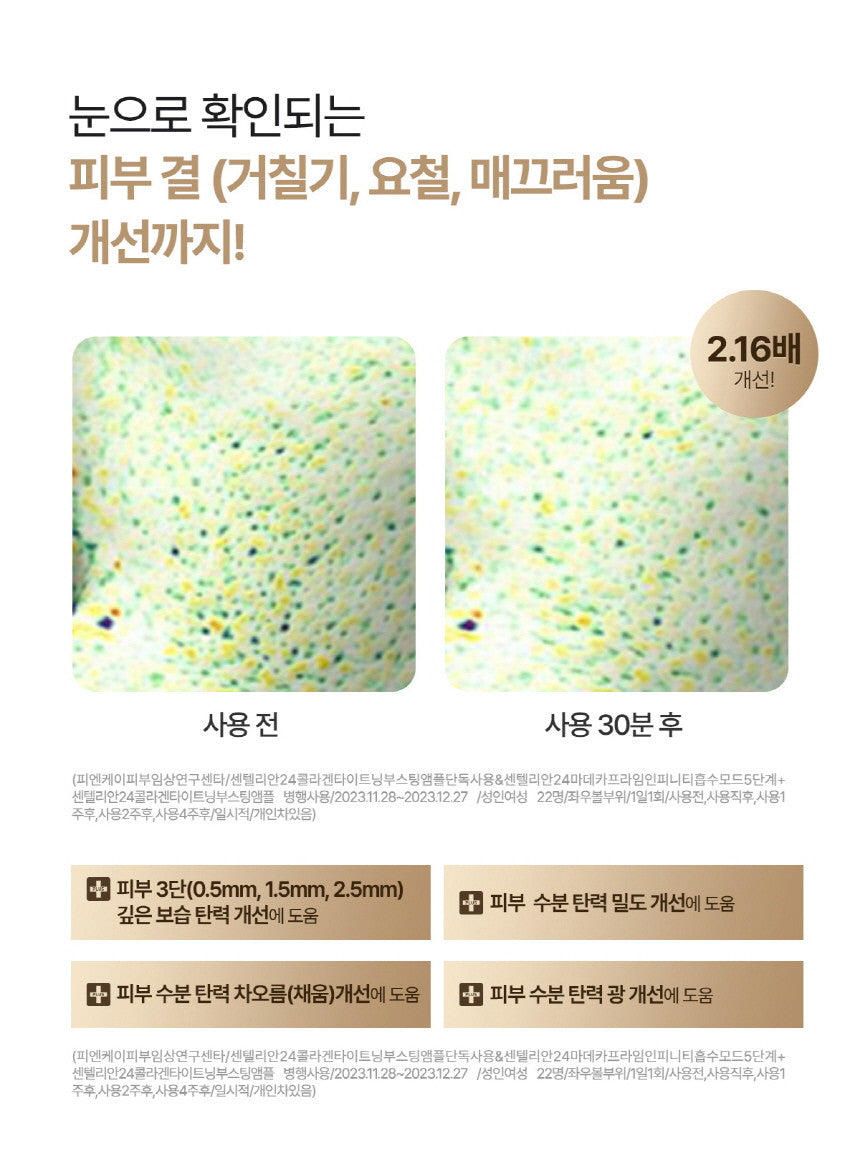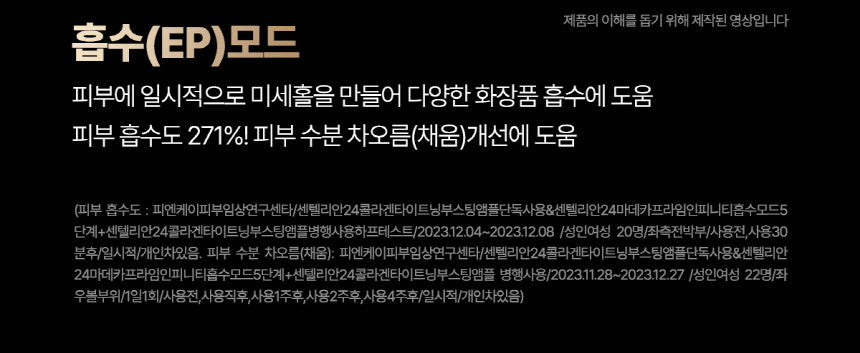 EP Mode: Creates temporary micro-openings in the skin, enhancing the absorption of various cosmetics. It improves skin hydration by 271%, significantly boosting moisture levels.