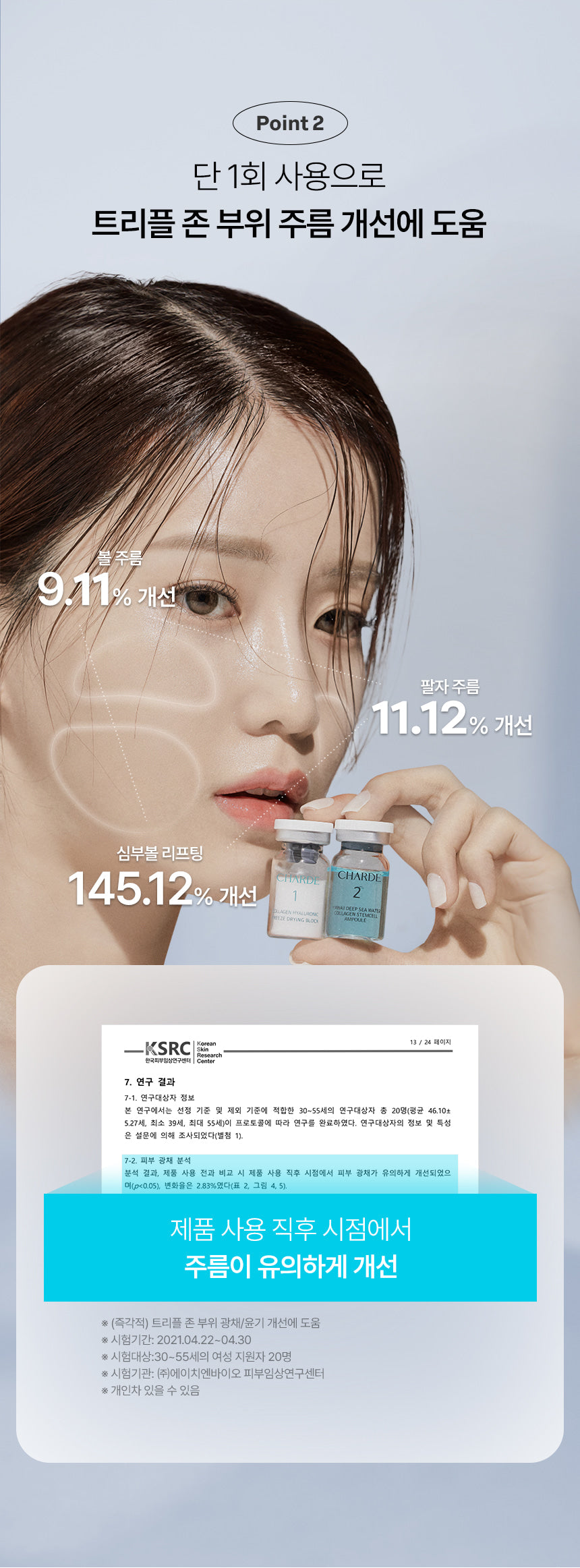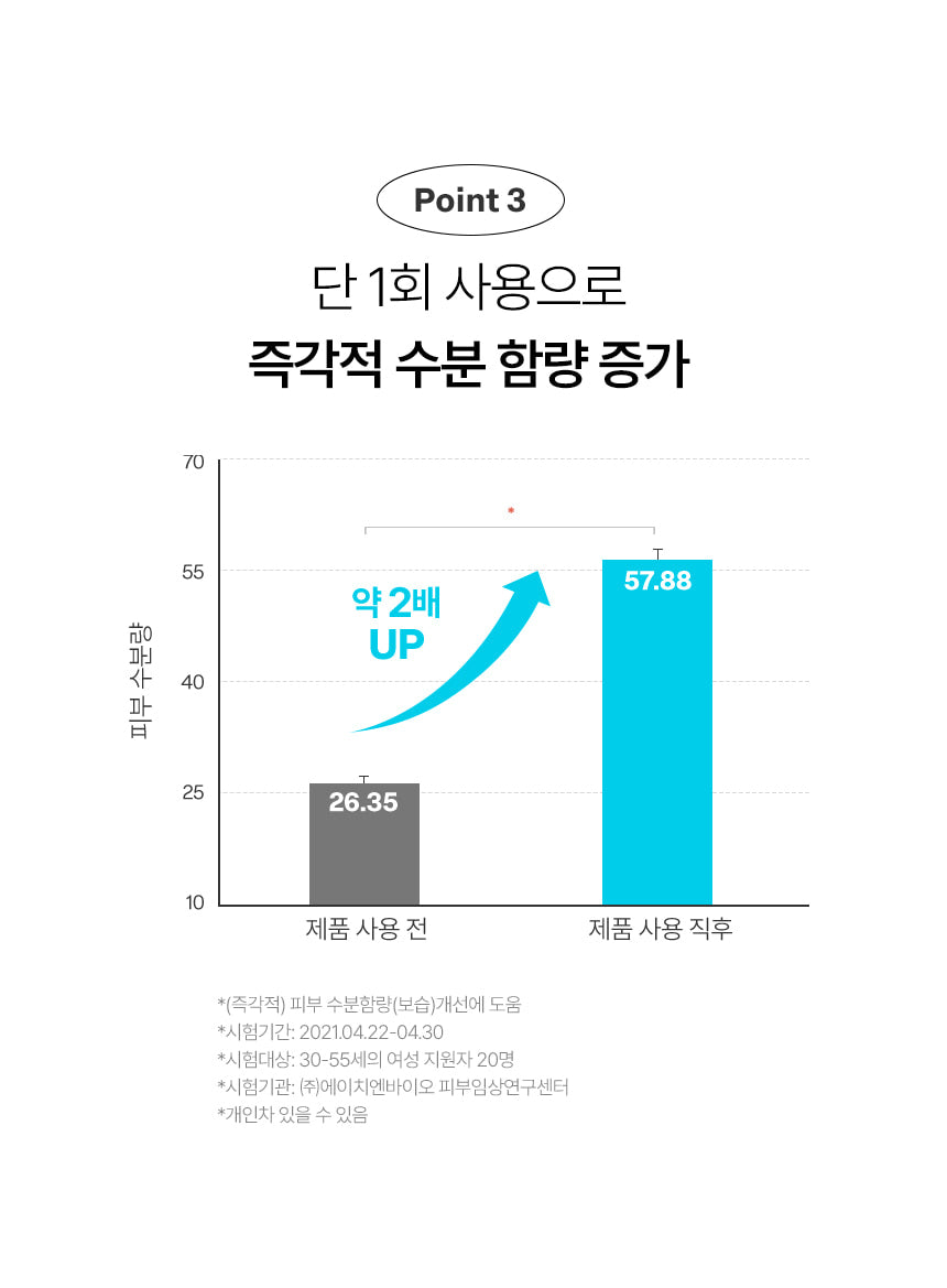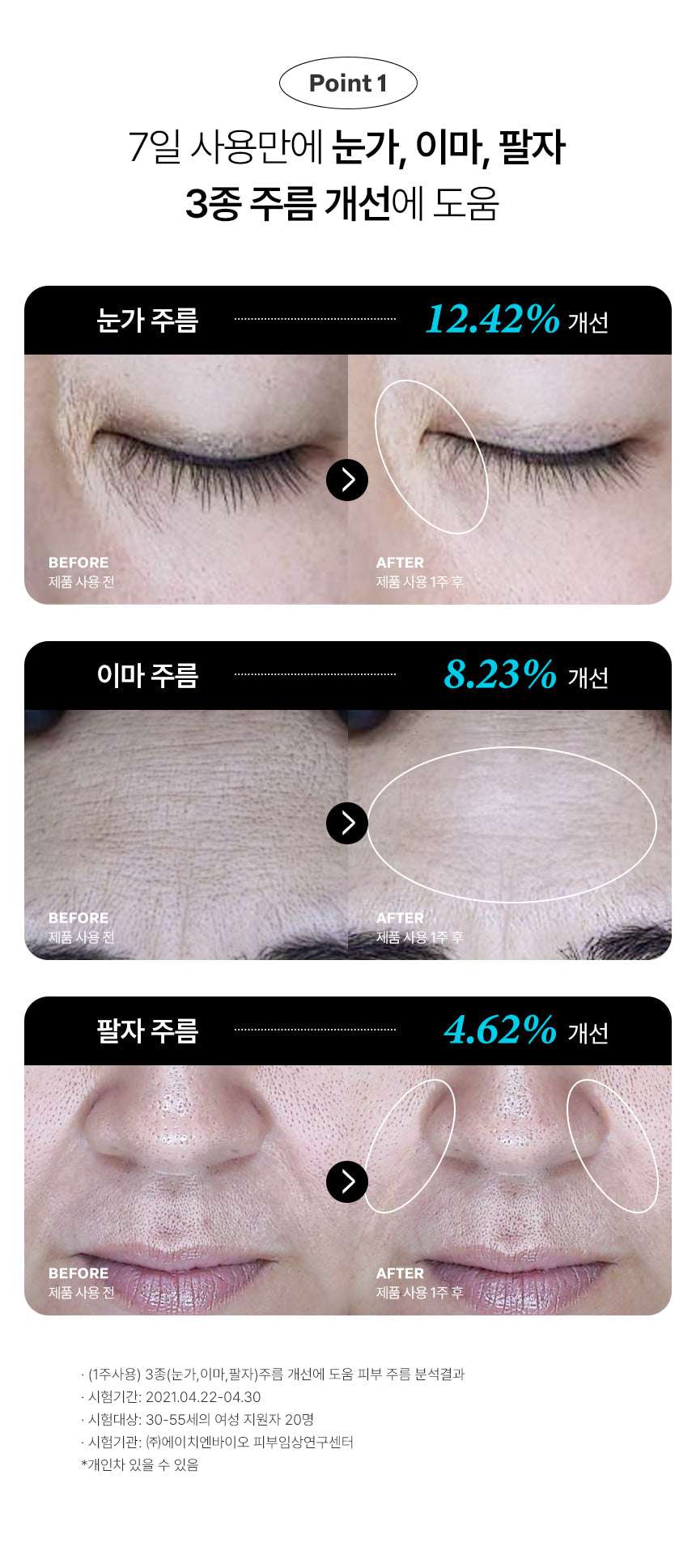 Point 1: Noticeable wrinkle improvement around the eyes, forehead, and smile lines in just 7 days.