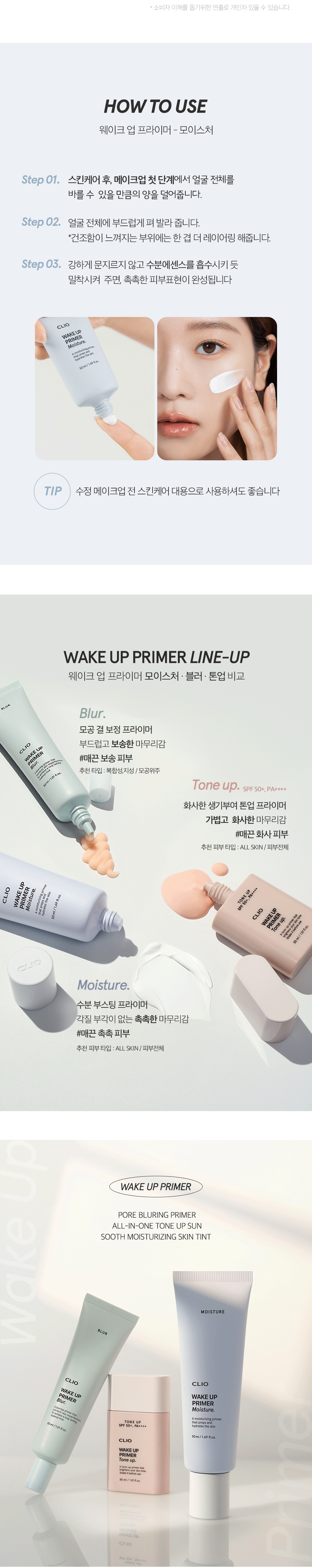 - Begin your makeup routine by applying a moderate amount of the CLIO Wake Up Primer Moisture after completing your basic skincare. This should be the first step in your makeup application process.