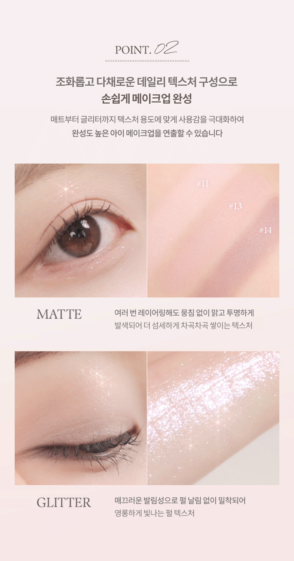 Glitter: Illuminate your eyes with our glitter shades, featuring a pearl texture that glides on smoothly and adheres without fallout. These shades are crafted to catch the light and sparkle, enhancing your makeup with a radiant glow.