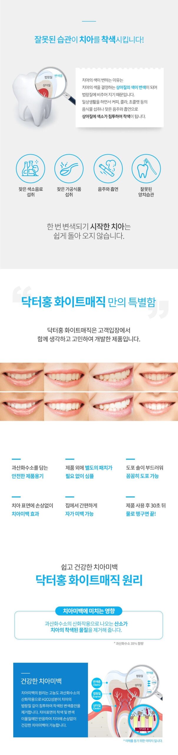 亮白魔法利用高濃度過氧化氫 (H2O2) 的氧化能力,深入清潔牙釉質,僅針對變色層和污漬,而不會損害牙齒健康。