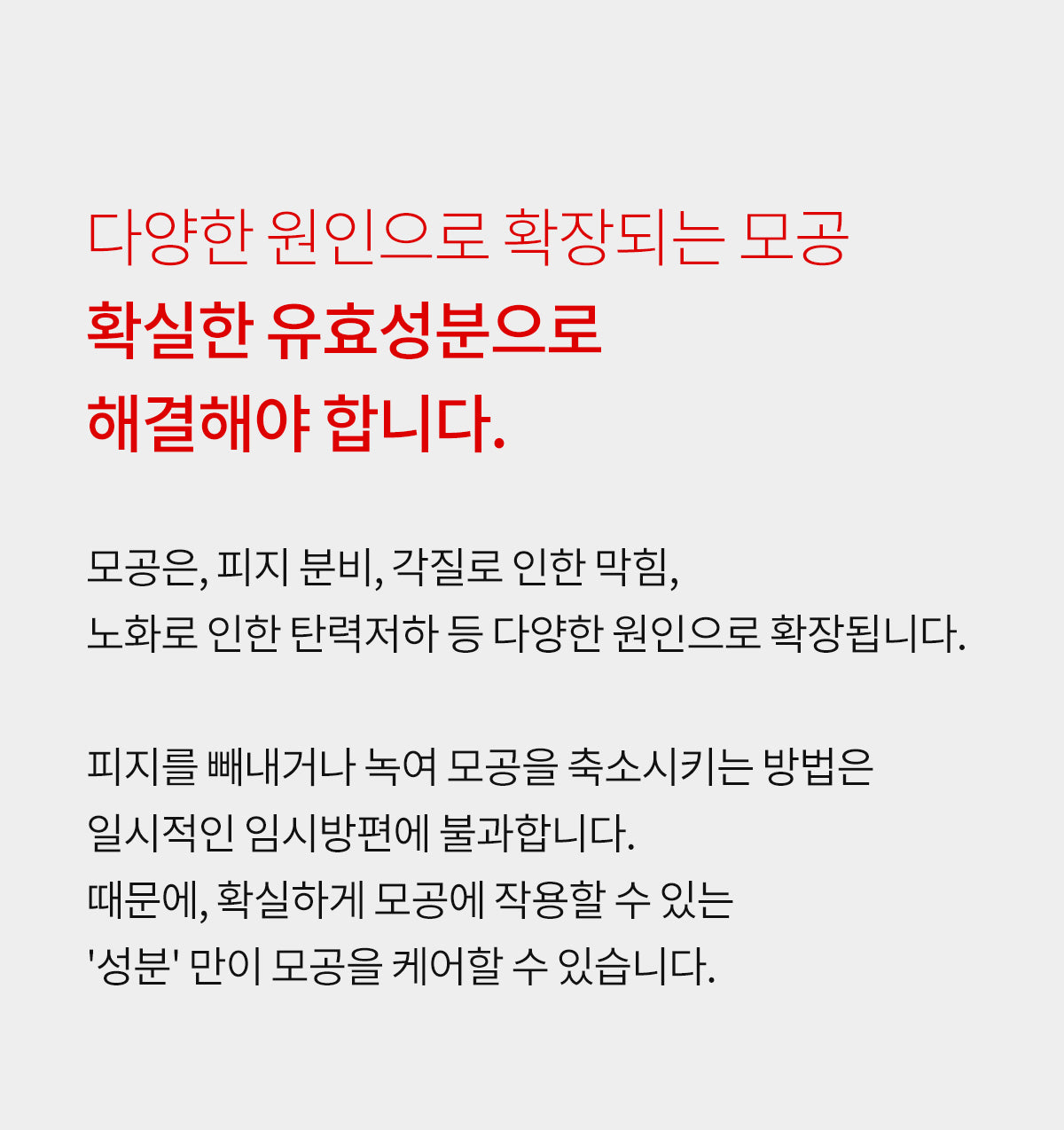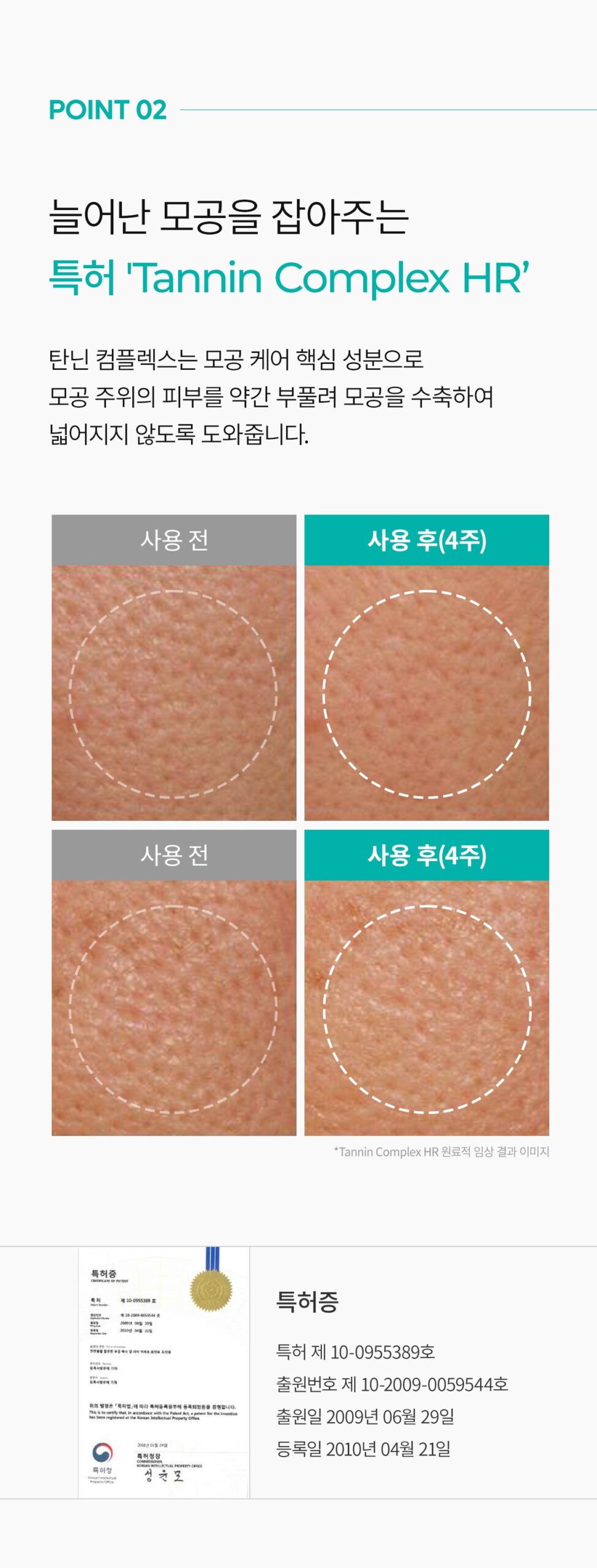 - Tightens and shrinks pores: Patented ingredient (Patent No. 10-0955389) slightly inflates the skin surrounding the pores to reduce their appearance.