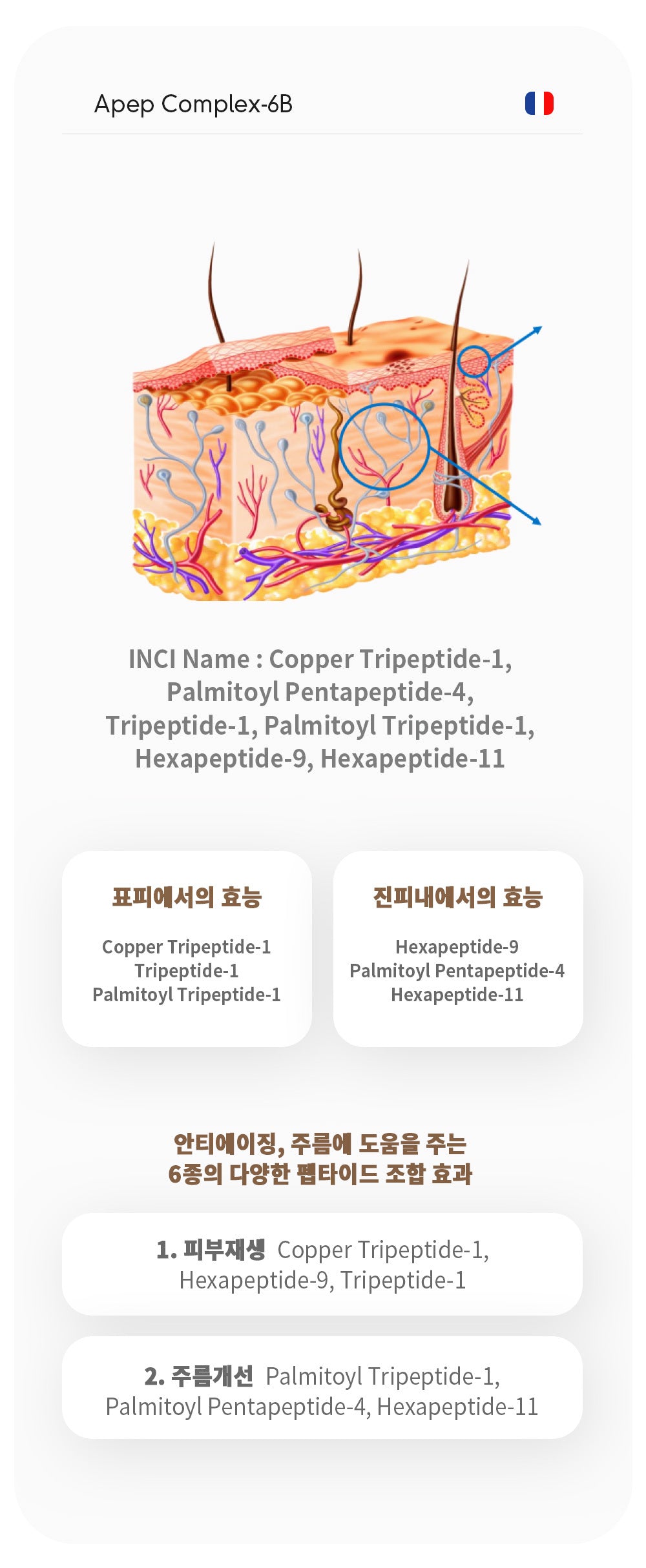 Apep Complex-6B is composed of a combination of 6 different peptides that help with anti-aging and wrinkle improvement.