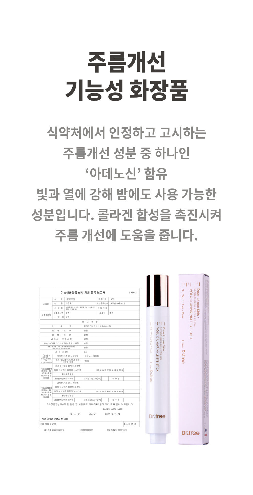 Contains adenosine, one of the wrinkle improvement ingredients recognized and notified by the Ministry of Food and Drug Safety.