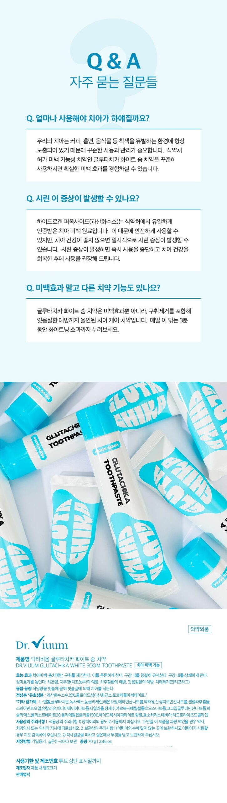 I’ve been using the Dr.Viuum Glutachika Toothpaste for a few weeks now, and I must say it’s top-notch! The quality of this toothpaste really stands out; it’s got a rich texture that feels luxurious when you’re brushing. Unlike other brands I’ve tried before, you can tell there’s some serious craftsmanship in the ingredients. My teeth feel cleaner than ever and there hasn’t been any sensitivity issues whatsoever—definitely solid durability! Plus, with all those benefits packed into one tube, it makes oral hygiene easier while giving me that confident shine before my meetings.