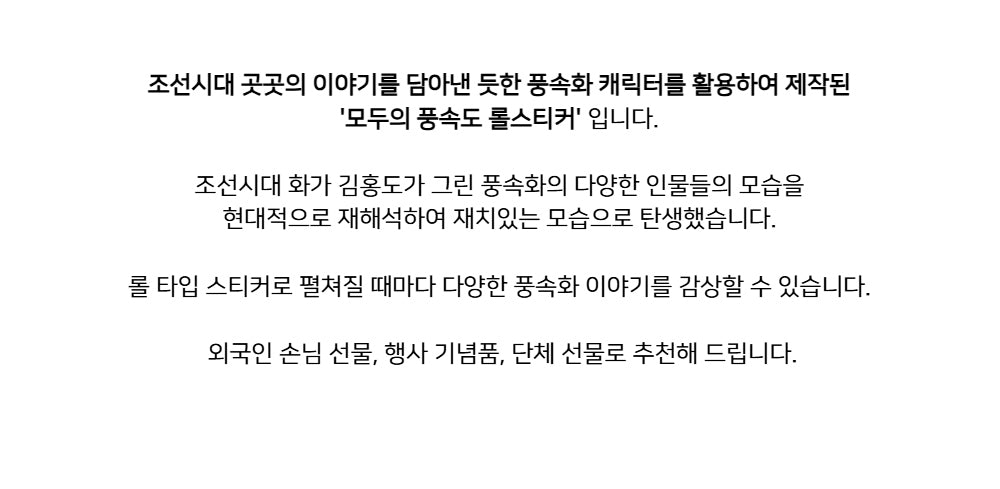 Step into the rich stories of the Joseon Dynasty with the K-Heritage Everyone’s Genre Painting Roll Sticker. This unique collection features characters from traditional genre paintings, thoughtfully reimagined in a charming and witty modern style. Each figure, originally illustrated by renowned Joseon painter Kim Hong-do, brings moments from everyday historical life to your fingertips.