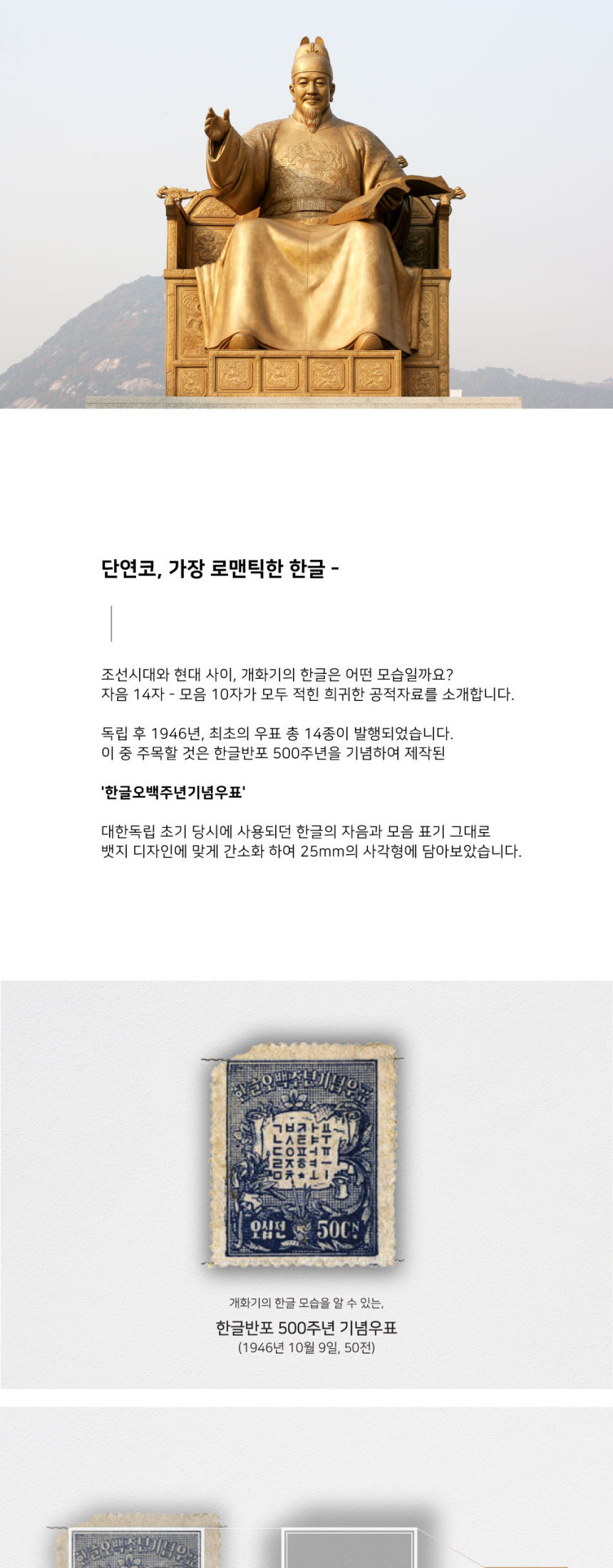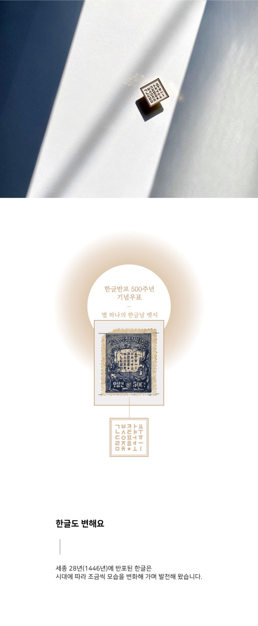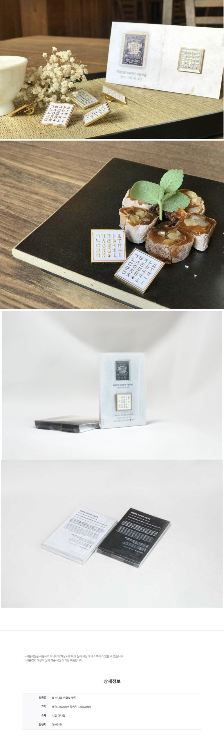 Inspired by the first Korean stamps issued post-independence in 1946, the design incorporates all 14 consonants and 10 vowels of Hangeul, stylized in a white-on-metal layout. Each element is carefully arranged within a compact 25mm square, reflecting the minimalist yet meaningful aesthetics of the era.