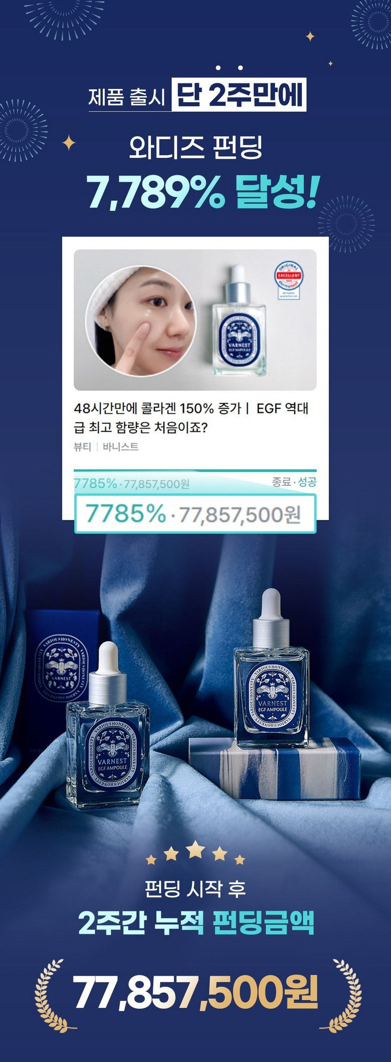 Experience the No. 1 solution in anti-aging cosmetics! The Vanist EGF Collagen Activation Ampoule achieved an astonishing 7,789% funding success on Wadiz in just two weeks after its launch. This groundbreaking ampoule redefines skincare by activating your skin’s natural collagen production, delivering unparalleled results in wrinkle reduction, elasticity improvement, and overall skin rejuvenation.
