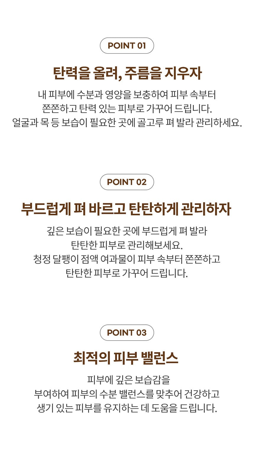 Gently apply the cream to areas that require deep moisturization to maintain firm skin. The clean snail secretion filtrate present in the cream enhances skin elasticity and firmness from within.