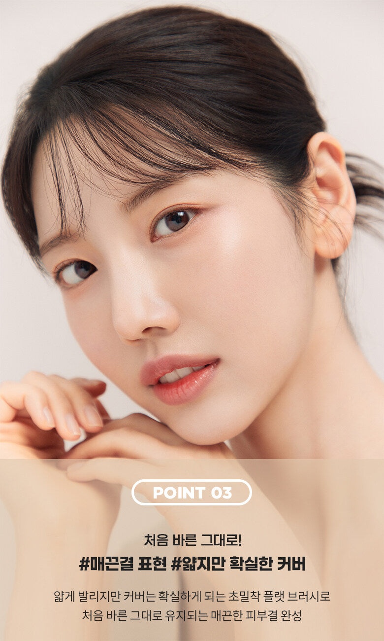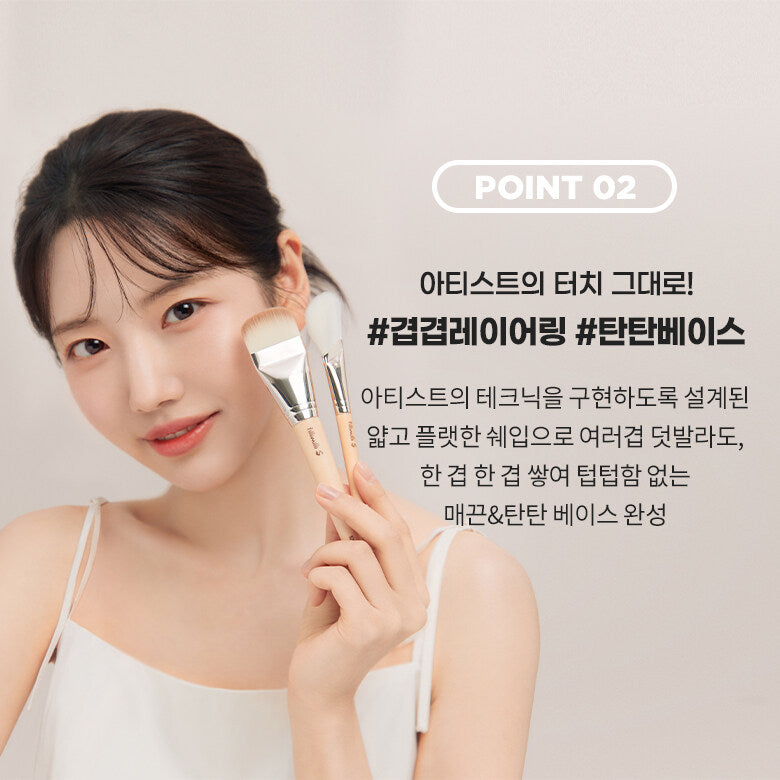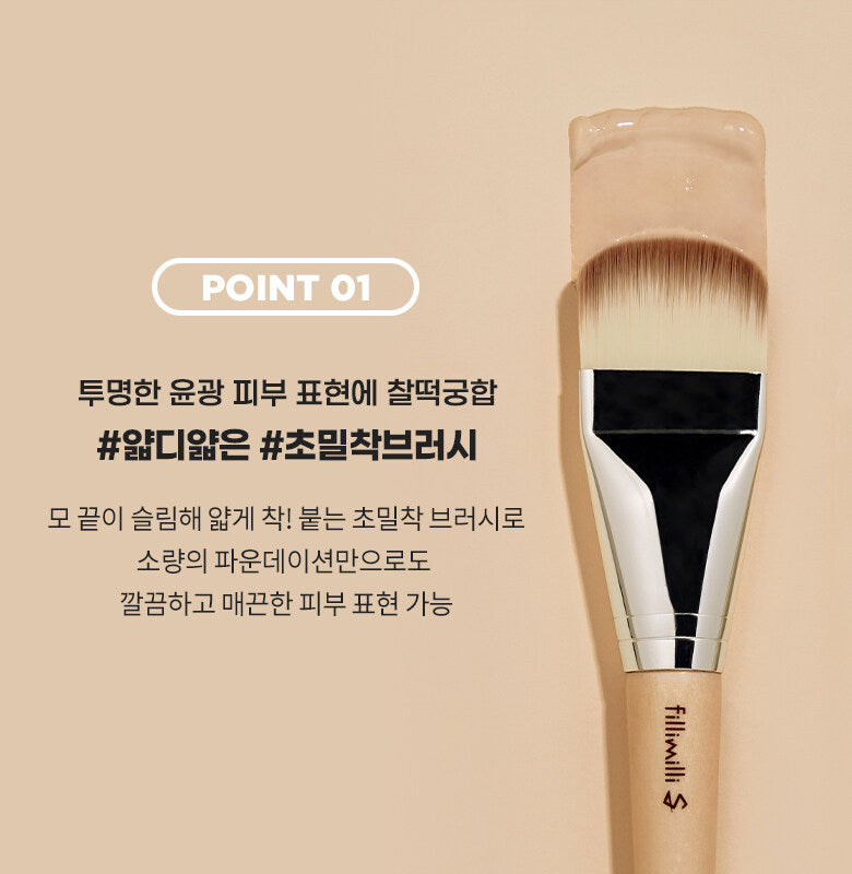 An ultra-adhesive flat brush that applies thinly but provides solid coverage to create a smooth skin texture that remains as it was when first applied.