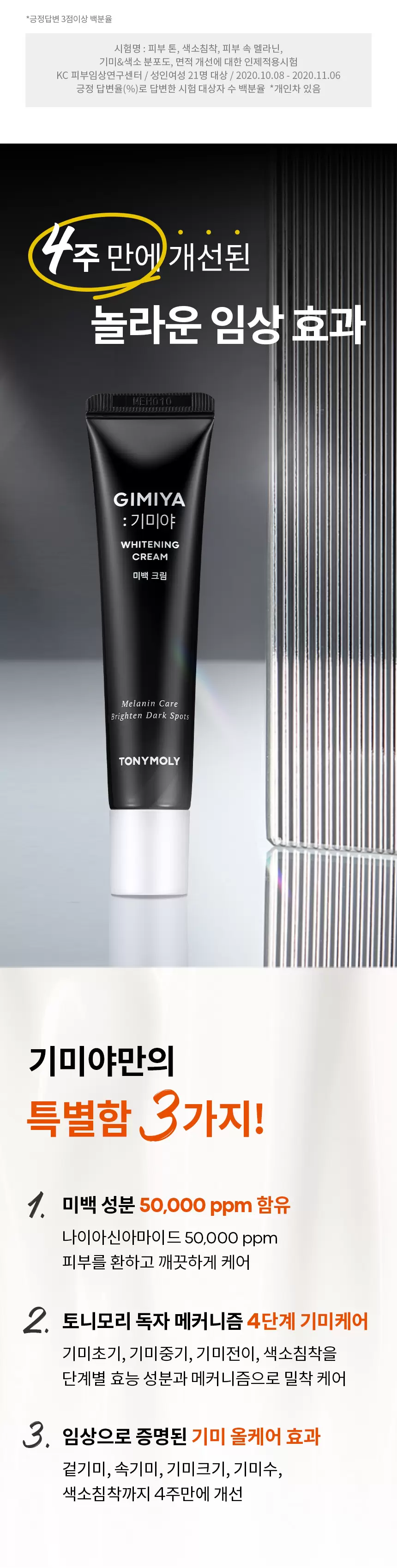Experience amazing clinical effects in just 4 weeks, validated by rigorous testing. The TONYMOLY Gimiya Whitening Cream is engineered for maximum effectiveness: