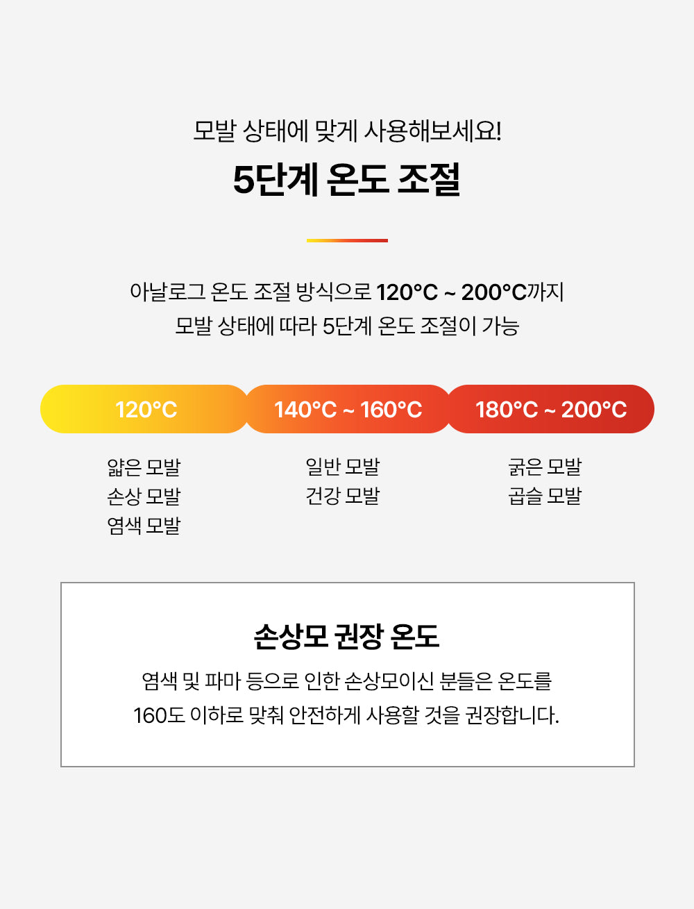 Adjust the heat to five levels to suit your hair type, minimizing the risk of damage.- 120°C: Thin, damaged, or color-treated hair