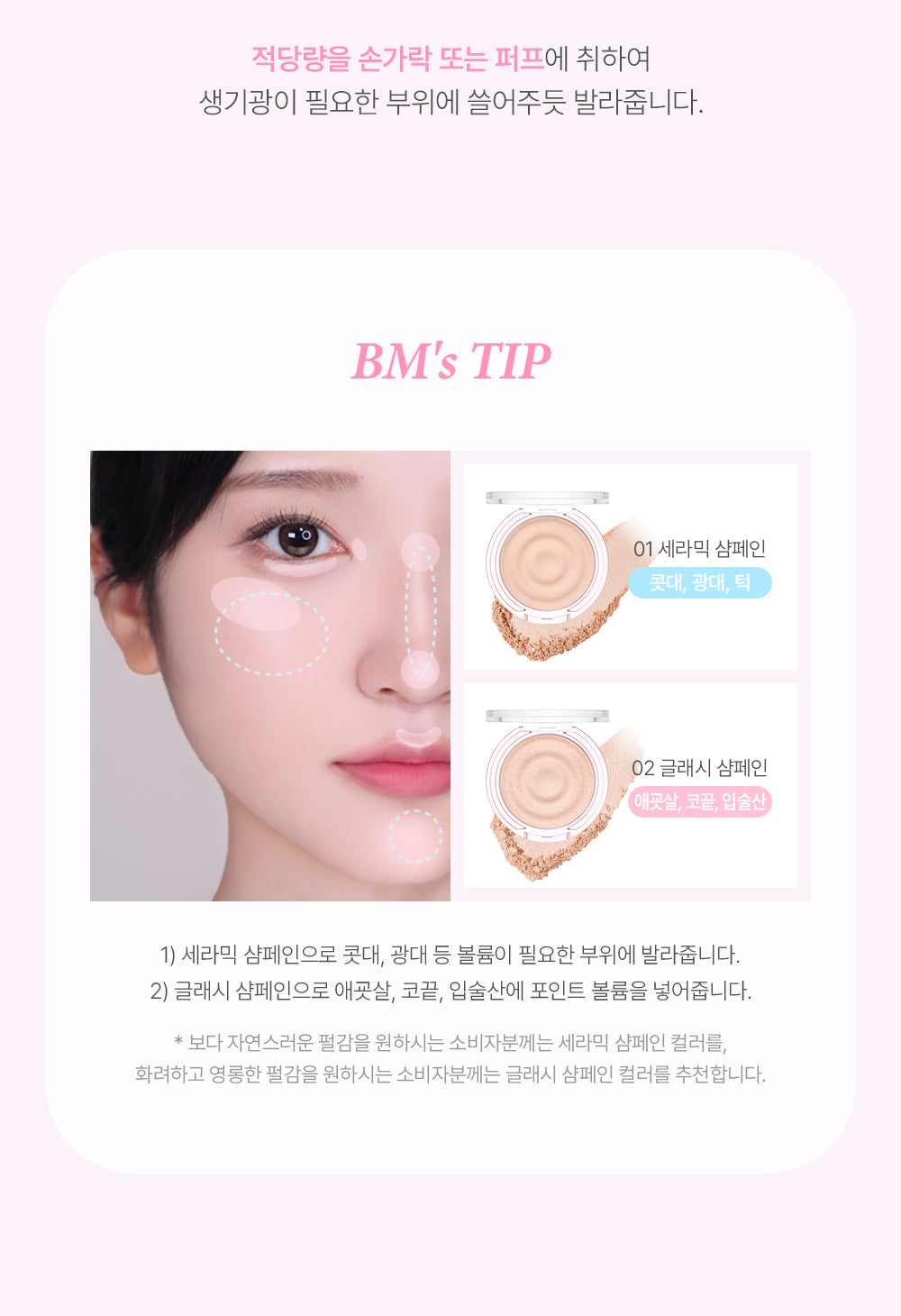 • Take an appropriate amount of the product using your fingers or a puff. Sweep it onto areas of your face where you want to create a lively, glowing effect.