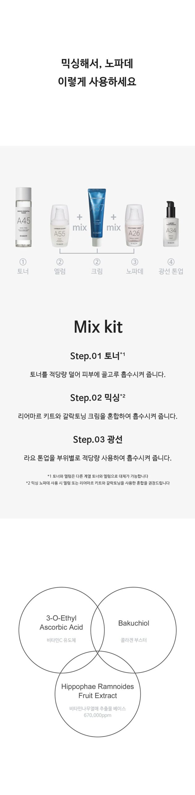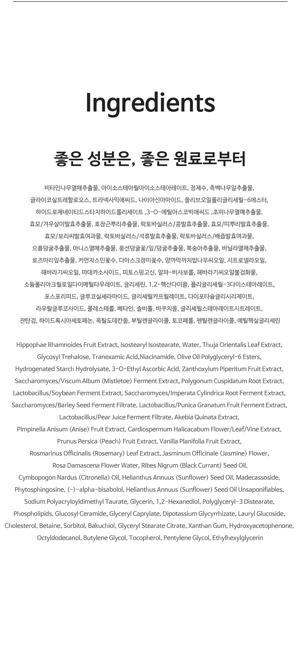 Hippophae Rhamnoides Fruit Extract, 3-O-Ethyl Ascorbic Acid, Bakuchiol, Glucosyl Ceramide, Niacinamide, Centella Asiatica Extract, Sunflower Seed Oil, Rosemary Leaf Extract, and other skin-nourishing compounds.
