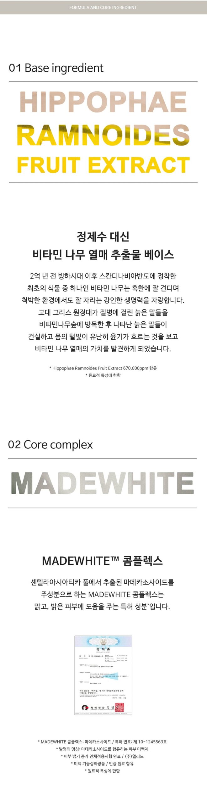 - MADEWHITE™ Complex: A patented ingredient extracted from Centella Asiatica for bright, clear skin.