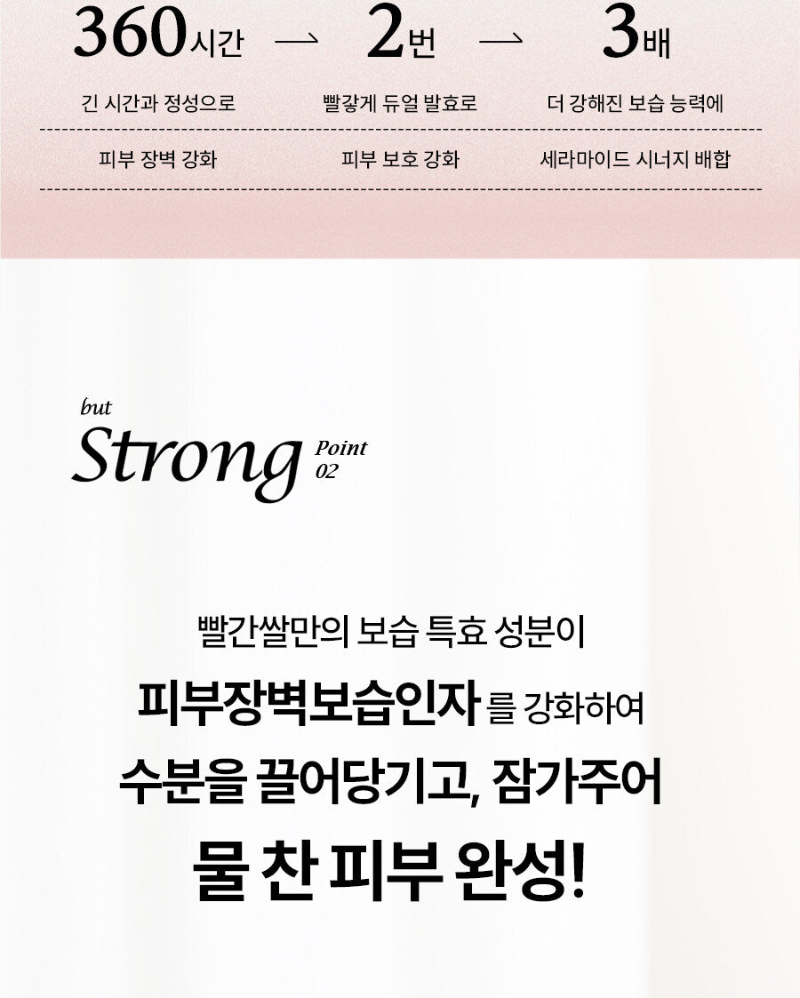 The 360-hour dual fermentation method resulted in rice essence that strengthens skin barrier moisturizing factor to attract and lock moisture in skin.