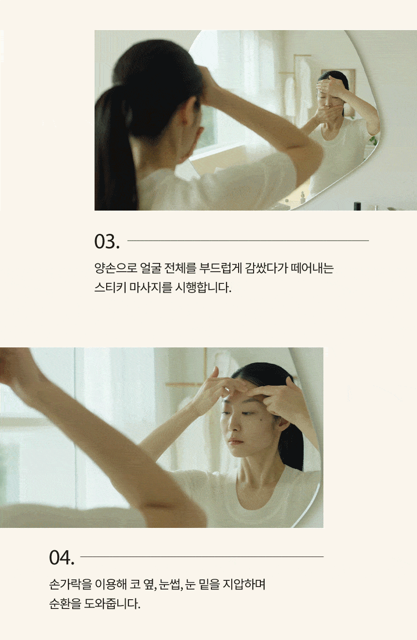 - Use a “sticky massage” motion by cupping your face with your palms.